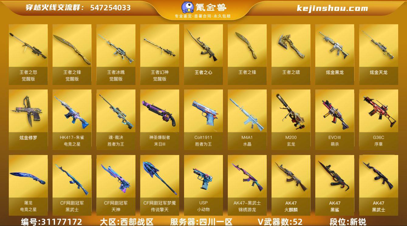 段位:新锐 VIP等级:VIP6 V武器数:52 王者武器数:7 炫金武器数:8 王者之怒-觉醒版,王者之锋-觉醒版,王者冰魄-觉醒版,王者幻神-觉醒版,王者之心,王者之锋,王者之啸 炫金黑龙,炫金天龙,炫金修罗 Colt1911-胜者为王,EVOⅢ-萌杀,G36C-序章,魂·裁决-胜者为王,HK417-朱雀-电竞之星,M200-玄龙,M4A1-水晶,神圣爆裂者-末日III,屠龙-电竞之星,黑武士-CF网剧冠军,天神-CF网剧冠军,擎天-CF网剧冠军,USP-小动物,AK47-黑武士-锦绣游龙,AK47-火麒麟,AK47-黑鲨,AK47-黑武士,M4A1-雷神,M4A1-黑骑士,M4A1-黑龙,M4A1-龙血,M4A1-武圣,M4A1-千变,M200-幻神,Barrett-毁灭,Barrett-极光,蔷薇大炮,AWM-天龙,Kar98k-星神,AA-12-雷霆,AK12-天启,HK417-朱雀,QBZ03-金色蔷薇,9A91-烈火,屠龙,龙啸,麒麟刺,擎天,USP-雷暴,柯尔特-电竞装甲,斩神刀-雷暴,裁决 王者-魅影 迷迭香,王者春,职业选手 HK417-朱雀-电竞之星-竞星跃动音效卡,屠龙-电竞之星-竞星跃动音效卡,Barrett-毁灭音效卡,M4A1-雷神音效卡,AK47-火麒麟音效卡