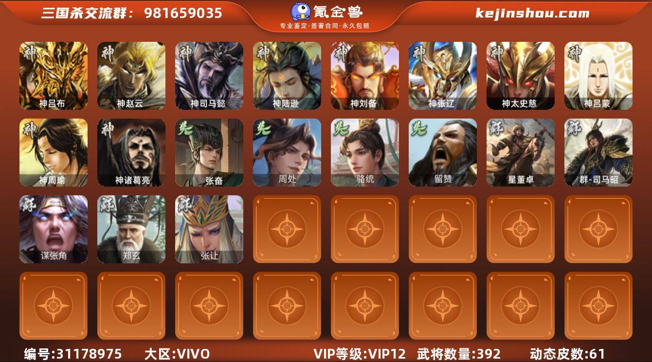 VIP等级:VIP12 官阶:大将军 史诗武将数量:61 动态皮肤数量:61 宝珠数量:3 将魂数量:5400 心愿积分数量:6300 卖家说:v12大将军,大部分将魂白嫖的武将都有,有7个珠子将,斗地主和军八都有可以玩的武将三卡足