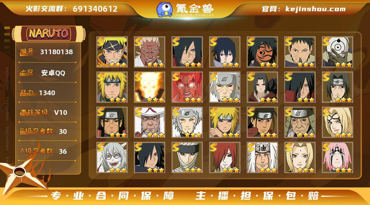 0B00C3 号 VIP10,1340W战力,S忍31个,A忍40个,本服排名246,战区排名未上榜,通灵兽22个,6时装,点券5,金币2678,高招券13,中忍2阶,忍者星数601