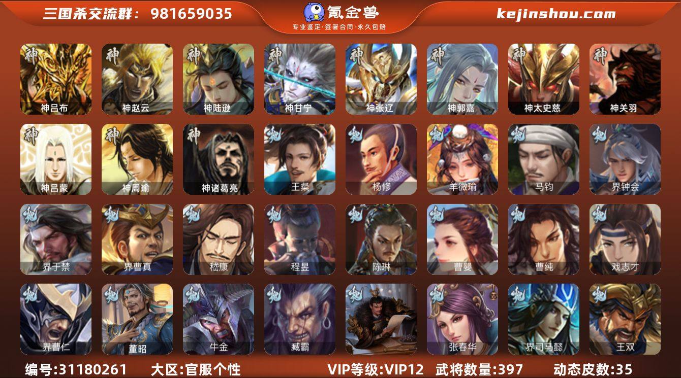 官阶:大将军;VIP等级:VIP12;史诗武将数量:54;动态皮肤数量:35;武将总数:397;史诗宝珠数量:2;将魂数量:622;神将:8;魏国史诗武将:24;蜀国史诗武将:12;吴国史诗武将:7;群史诗武将:15 神吕布,神赵云,神陆逊,神甘宁,神张辽,神郭嘉,神太史慈,神诸葛亮,王粲,杨修,羊徽瑜,马钧,界钟会,界于禁,界曹真,嵇康,陈琳,曹婴,曹纯,戏志才,程昱,关索,谋刘备,马云騄,谋马超,诸葛瞻,周群,赵襄,张星彩,王平,沙摩柯,界黄忠,花鬘,周处,骆统,留赞,界朱然,界徐盛,界步练师,贺齐,裴秀,左慈,张让,杨彪,星甘宁,陶谦,麹义,南华老仙,祢衡,沮授,界左慈,界李儒,公孙康,许攸,兀突骨,神吕蒙,神周瑜,神关羽,SP关羽,SP曹仁,SP蔡文姬,乐进,曹昂,诸葛诞,朱灵,文聘,SP姜维,张春华,钟会,曹冲,郭淮,满宠,界王异,界曹操,界司马懿,界夏侯惇,界张辽,界许褚,界郭嘉,李典,曹真,韩浩史涣,陈群,曹叡,曹休,钟繇,司马朗,王基,李通,郭皇后,孙资刘放,辛宪英,界甄姬,吕虔,鲁芝,蒯越蒯良,界典韦,界荀彧,界徐晃,杜畿,界曹丕,毌丘俭,界邓艾,张恭,贾逵,界曹植,界满宠,界郭淮,卞夫人,界陈群,华歆,蔡贞姬,袁涣,王双,崔琰,毛玠,阮慧,谋徐晃,牛金,界夏侯渊,界曹仁,臧霸,董昭,SP孙尚香,关银屏,夏侯霸,马良,关兴张苞,廖化,界马岱,关平,简雍,刘封,界法正,界关兴张苞,界刘备,界关羽,界张飞,界赵云,界马超,SP徐庶,吴懿,周仓,张松,刘谌,夏侯氏,糜竺,马忠,孙乾,李严,黄皓,吴苋,秦宓,界黄月英,界诸葛亮,赵统赵广,严颜,界伊籍,界卧龙诸葛,界庞统,界孟获,界祝融,陈到,界姜维,界刘禅,吕凯,张翼,杨仪,界廖化,邓芝,界简雍,费祎,糜夫人,界周仓,向宠,宗预,刘巴,界张嶷,谋张飞,诸葛果,界魏延,蒋琬费祎,甘夫人,鲁肃,孙茹,凌操,大乔小乔,诸葛恪,诸葛瑾,孙鲁育,程普,韩当,潘璋马忠,虞翻,朱然,界周泰,界甘宁,界吕蒙,界黄盖,界周瑜,界大乔,界陆逊,孙鲁班,朱桓,顾雍,孙休,朱治,全琮,步骘,阚...