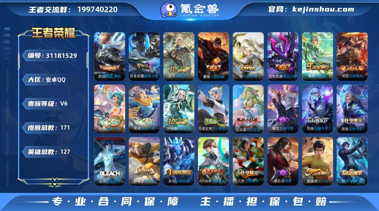 BHC70955,,1星元,,安卓Q-V6-最强王者段位-127英雄-171皮肤-1典藏皮肤-5传说-41史诗 【英雄全皮】:孙权全皮 【荣耀典藏】:李白鸣剑曳影 【传说皮肤】:后羿神树通天,曹操万灵伏威,桑启鸣野蒿,镜炽阳神光,宫本武藏地狱之眼 【限定皮肤】:狄仁杰阴阳师,赵云皇家上将,高渐离玩趣恶龙,元歌云间偶戏,马可波罗山海玄木吟,狄仁杰魔术师,狄仁杰万华元夜,达摩星际陆战队,达摩沙漠行僧,项羽海滩派对,老夫子醍醐杖,关羽冰锋战神,程咬金演武夺筹,亚瑟潮玩骑士王,孙悟空孙行者,刘备百相守梦,李元芳云中旅人,钟馗驱傩正仪,干将莫邪胡桃夹子,鬼谷子原初探秘者,鬼谷子五谷丰年,苏烈千军破阵,弈星混沌棋,梦奇顽趣,沈梦溪大漠名商,裴擒虎李小龙,裴擒虎擒涛扼浪,上官婉儿梁祝,鲁班大师探海日志,桑启海盐诗旅,张良古海寻踪,鬼谷子天穹祈灯,刘邦剑破天穹,程咬金群星魔术团,周瑜熔金海岸 【年限皮肤】:马可波罗山海玄木吟 【赛季限定】:弈星混沌棋,老夫子醍醐杖,鬼谷子原初探秘者,狄仁杰万华元夜,程咬金演武夺筹,钟馗驱傩正仪,苏烈千军破阵,达摩沙漠行僧,沈梦溪大漠名商,李元芳云中旅人,桑启海盐诗旅,裴擒虎擒涛扼浪,鲁班大师探海日志,张良古海寻踪,鬼谷子天穹祈灯,刘邦剑破天穹,东皇太一噬灭天穹,太乙真人谧流熔炉,钟馗虚灵犬护,甄姬逆浪荇歌,亚瑟荣光之誓,梦奇顽趣,牛魔星界战将,项羽九幽镇关 【战令限定】:元歌云间偶戏,亚瑟潮玩骑士王,达摩星际陆战队,周瑜百相守梦,孙策百相守梦,周瑜线条小狗,小乔线条小狗 【史诗皮肤】:赵云皇家上将,赵云未来纪元,貂蝉圣诞恋歌,狄仁杰魔术师,宫本武藏鬼剑武藏,孙尚香水果甜心,嬴政摇滚巨星,妲己魅力维加斯,妲己女仆咖啡,墨子金属风暴,李白千年之狐,吕布末日机甲,关羽冰锋战神,花木兰水晶猎龙者,夏侯...
