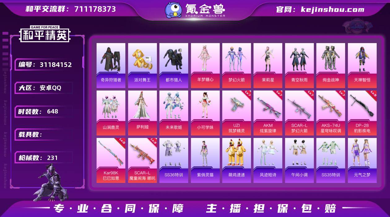 热力值:77969 时装数:648 枪械数:231 战备数:182 游戏等级:66 卓越印记:1 传奇印记:1 绝世印记:0 羊梦糖心,梦幻火箭,茉莉星,青空秋雨,山涧鹿灵,萨利娅,天禅智恒,未来歌姬,绚金战神,小可学妹 七级AKM-炫紫旋律,七级AKS-74U-星穹咏叹调,七级SCAR-L-梦幻火箭,七级UZI-筑梦精灵,五级DP-28-豹影疾电,五级Kar98K-巳巳如意,三级SCAR-L-魔童闹海 哪吒 魔童闹海 哪吒降落伞,动力核心飞行器,梦幻火箭飞行器,萌物绒绒飞行器,千面幻镜飞行器,齐天大圣飞行器,太空嘟嘟飞行器,暗星紫秘降落伞,碧影闪光降落伞,垂柳戏鸭降落伞,绯穹魔姬降落伞,幻彩电音降落伞,莲影清波降落伞,梦幻火箭降落伞,齐天大圣降落伞,赛博古神降落伞,时光之誓降落伞,旋转彩虹降落伞,炎氏战神降落伞 SS36特训,奇异狩猎者,萌鸡速递,紫俏灵猫,风迹短诗,SS35特训,午间小调,元气之梦,薄荷星砂,凌霄紫焰,擎苍青焰,SS34特训套装,朱霞炽焰,冰冻风暴,缤纷果语,缤纷假日,滨海假日,白色伏地魔,贝斯之夜,白熊同盟,春光漫游,长空猛禽,春日漫步,顶瓜瓜,大橘大利,都市猎人,淡雅花蕊,飞驰魅影,绯格组合,疯狂小兔子,粉恋花,福星高照,飞行日记,格斗先锋,光矢逐梦,龟仙人,光之冒险,贵族骑装,幻彩翩翩,华灯初上,鹤鸣,虎虎生威吉莉,活力之心,海琴烟,黄色运动,幻世战舞者,和煦暖阳,黑夜传说,绝对偶像,极地朋克,军刀雅典娜,金戈铁马,惊鸿侠骨,娇憨猪猪,竞技达人朋克,竞技名士,吉莉礼服,坚韧舞者,极速竞梦,金鼠迎春,街头潮人,锦衣飞扬,金羽特工,金耀舞者,绛羽幽主,空岛之星,快闪甜心,狂沙舞者,空投萌叽,蓝冰羽,蓝调潮人,龙的传人,猎鹰,六六大吉,黎明保卫者,猎梦纪元,灵蜜圈圈,浪漫天命,龙舌兰冰茶,龙腾端午,恋语绒绒,漫步者,猛禽,妙红点点,梦幻奶油,萌黄之夏,魅力单车,麻辣教官,懵萌河马,萌趣咩咩,墨染幽兰,明鸳圣池,霓虹极客,霓虹街区,霓虹热舞,柠萌假日,牛气冲天,牛气满满,暖心熊熊,派对舞王,破蛋小黄鸡,轻风白浪,绮丽涂鸦,俏皮奶喵,青玉碎影,云朵鹅,瑞龙福将,荣耀,人气偶像,沙漠兵团,神气柴柴,SS17特训,SS18特训,SS19特训,SS20特训,SS21特训,SS22特训,SS23特训,SS24特训,SS25特训,SS26特训,SS27特训,SS28特训,SS29特训,SS30特训套装,SS31特训套装,SS32特训套装,SS33特训套装,巳巳如意,探宝勇士,天籁歌者,甜蜜熊情侣,甜梦熊熊,涂山之恋,特训学院,甜心亚梦,团圆交子,田园牧歌,特战装甲,王牌教练,炫蓝之夏,小鸟芋圆,雪绒豹,旭日情侣,夏日倾情,夏日音浪,血色贵族,雪山精英,虚音幻奏,夏雨游龙,异彩先驱,耀粉歌者,银尘,遗落祭司,雨林探路者,音速流光,玉兔迎春,鹰眼刺客,鱼渊荷华,燕燕于飞,紫幽梦 PKM-啾咪啾咪,MK12-乌木金纹,UZI-炫彩糖果,AKM-霓彩脉冲,Famas-霓彩脉冲,SLR-霓彩脉冲,十字弩-异瞳寒姬,DBS-风迹短诗,蜜獾-风迹短诗,MK12-风迹短诗,Mk47-风迹短诗,莫辛纳甘-风迹短诗,破片手榴弹-拽到爆炸,S12K-霓彩脉冲,AKM-涂鸦街区,AUG-紫晶流影,M416-魔童闹海 敖闰,破片手榴弹-火尖莲影,撬棍-火尖枪,燃点复合弓-火尖莲影,AMR-喜羊羊与灰太狼,爆炸猎弓-喜羊羊与灰太狼,P90-玩趣呆呆,AC-VAL-快闪甜心,AC-VAL-魅影蝠王,AC-VAL-天降萌叽,AC-VAL-甜心亚梦,AKM-彩虹符号,AKM
