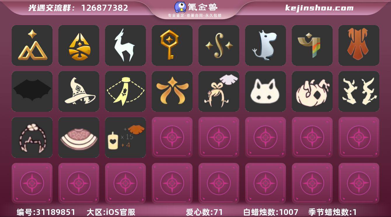 10季11翼潜海面具鲲灯巫树犄角白枭白雪斗篷周年抱枕明制帽黄鼠狼面具 资源: 蜡烛 4840 爱心128 红烛36 翼11 已毕业地图:全图毕业 毕业季节: 潜海季 表演季 欧若拉季 追忆季 夜行季 拾光季 归巢季 九色鹿季 彩染季 青鸟季 稀有礼包:橘子发饰 彩虹耳机 巫术犄角 大桔大利 白雪斗篷 绊爱 祥云雨伞 周年抱枕 热门裤子:绑带舞服 奔月长袍 妮妮长裙 海洋武士裤 白棉裤 紧身连体衣 武士裤 小丑服 红色流珠裙 美工衣 探险燕尾服 暗彩武士裤 米色西装裤 热门面具:矮人面具 狐狸面具 黄鼠狼面具 氧气面具 黄眉面具 一字眉 棕熊面具 向导面具 龙头 玫瑰花面具 玫瑰面具 黑脸 粽叶面具 鸟羽面具 热门发型:海藻头 爆炸头 大胡子 小飞象 雨妈 卡卡 平菇 箬笠 蝴蝶结 公主头 粗辫 水母头 书虫 总裁头 正太头 高马尾 明制帽 郡主头 斗笠 绿丝带 虚荣 白枭 圆环发辫 留辫蘑菇头 李逍遥发型 彩色脏辫 彩羽发型 双辫发型 遥鲲发型 南瓜头 巫师帽 女巫发型 绊爱发型 光头 热门头饰:粗框眼睛 尖角牛仔帽 牛仔帽 飞羽方式 大橘大利 花环 珊瑚发饰 蓝色音乐会 红耳机 辫子发饰 九色鹿鹿角 彩虹耳机 巫术犄角 热门斗篷:五角星斗篷 花瓣斗篷 红金斗篷 黑金斗篷 白金斗篷 蝴蝶斗篷 汉服斗篷 燕尾斗篷 占医院换的 透明蝶翼 小浣熊斗篷 毛绒斗 布条斗篷 布丁斗篷 彩霞斗篷 国风斗篷 灰色斗篷 史力奇 斗篷 姆明季斗篷 镂空斗篷 镂空三条斗 彩染季围巾斗篷 红色探险斗 星空斗篷 鸟羽斗篷 樱花斗篷 马蹄莲斗篷 绿芽 海洋斗篷 漩涡 斗篷 水纹斗篷 暗彩斗篷 太阳光束斗篷 白雪斗篷 蝙蝠斗篷 绊爱斗篷 热门背饰:号角 季卡相机 进阶版相机 祥云雨伞 红色雨伞 椅子 吊床...