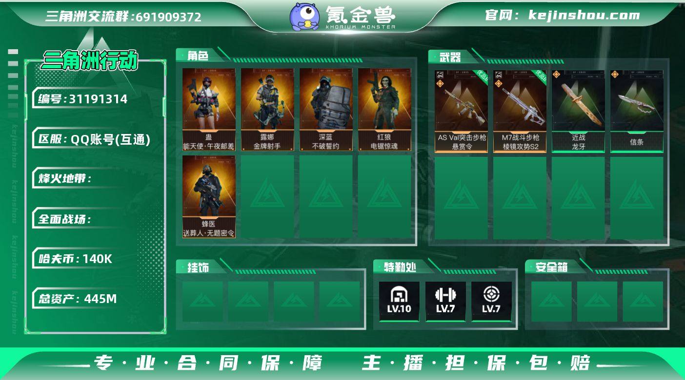 S1022总资产445M,哈夫币14w,典藏2 近战3 枪皮数量163,蛊-能天使午夜邮差/露娜-金牌射手/红狼-电锯惊魂/深蓝-不破誓约/蜂医-送葬人无题密令,近战-龙牙/近战-信条,M7战斗步枪-棱镜攻势S2(优品B)/AS Val突击步枪-悬赏令(优品B)战场等级9列兵, 行动等级60钻石,安全箱等时效性道具请以游戏内数据为准,详情请看图 海洋之泪
