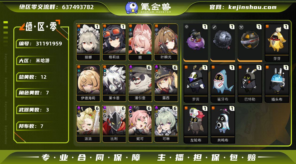 冒险等级:54 总黄数:12 五星角色数:7 菲林底片数量:2 菲林数量:40 加密母带数量:0 1命丽娜,1命格莉丝,0命叶瞬光,0命照,0命伊德海莉,0命莱卡恩 6命潘引壶,6命露西,6命派派,6命比利,6命妮可,6命可琳,5命真斗,3命波可娜,3命安东,2命赛斯,2命苍角,1命安比,0命本 1精海妖摇篮,1精啜泣摇篮,1精硫磺石 1精芽芽,1精罗宾,1精鲨牙布,1精巴特勒,1精插头布,1精左轮布,1精共鸣布 白心旧影,漪光夜曲