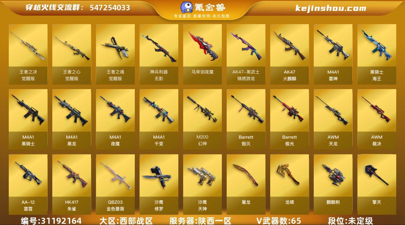 陕西一区-70V-6王者-0炫金 【热门武器】:QBZ03-金色蔷薇,HK417-朱雀,M200-幻神,荣耀世冠-柯尔特,M4A1-黑骑士*2,USP-雷暴,沙鹰-修罗*2 【音效卡】:AK47-火麒麟音效卡,M4A1-雷神音效卡,M4A1-黑骑士音效卡,Barrett-毁灭音效卡,Barrett-碧霄极光音效卡*2,白虎-盛典舞曲音效卡,炼狱-百战金芒-庆典舞曲音效卡 【皮肤】:幻神-丹凤,幻神-青鹤,幻神-KZ-CFPLS25冠军 皮肤,QBZ03-荣耀世冠白鲨,QBZ03-CFS2024 皮肤*2,Kar98K-星神-AG-CFPLS21冠军皮肤,雷神-冠军之魄,雷神-CFS十周年纪念版 皮肤,M4A1-再燃火线,火麒麟-雷神*2,火麒麟-平天大圣,火麒麟-心动糖果,毁灭-CFS2020,黑龙-暗月,屠龙-巅峰荣耀 皮肤,轻型军用手斧-再燃火线,麒麟刺-甜蜜糖果 皮肤 【角色】:零,迷迭香,电竞教官-云悠悠,王者-瞳-闭月羞花,王者-零,王者玲珑,乔伊教练,云海玲珑,初恋灵狐,电竞少女,嘉年华灵狐,娟娟,猎狐者-追月,零-水下丽影,灵狐者-X,麻雀,潘多拉-X,潘多拉-甜心教官,莎莎,斯沃特-X,铁骑荣耀,樱-战斗天使,影武者-X,游珑儿 【人偶武器】:AWM-灵狐-15周年嘉年华,迷你深渊冰龙*2,迷你波特博士,夺魂,深渊终结者手雷,迷你艾比 【暴走生化】:超级对讲机 【挑战大师】:AK47-冰龙粉碎者,冰龙粉碎者-白马银枪,VEPR-12-金魔,激光毁灭者III,神圣爆裂者-末日III 【英雄级武器】:M4A1-千变,AK47-火麒麟*2,M4A1-黑龙,M4A1-雷神*3,M4A1-黑骑士*2,HK417-朱雀,M4A1-夜魔,无影-神兵利器,黑武士-锦绣游龙,QBZ03-金色蔷薇,王者之心-觉醒版,王者之魄-觉醒版,黑骑士-海王,AWM-天龙*3,Barrett-毁灭,Barrett-极光,AWM-裁决,M200-幻神,王者之怒-觉醒版,王者之力-觉醒版,炼狱-百战金芒,AA-12-雷霆,沙鹰-修罗*2,沙鹰-天神,USP-雷暴,荣耀世