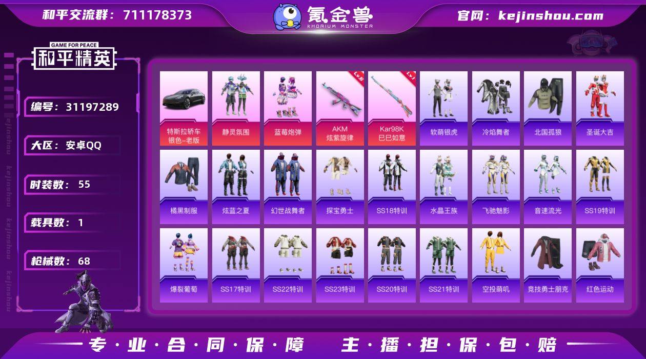 HT18(可二次)【1载具2粉装 2特效枪 Q32级2太阳】安Q-55套装 68枪皮 22738热力值 1王牌印记 历史超级王牌5星【1载具】特斯拉3银色【2粉装】静灵氛围 蓝莓炮弹【2特效枪】AKM-炫紫旋律(6级) Kar98K-巳巳如意(2级)【15热门】雪山精英 软萌银虎 暗夜契约 粉甜马卡龙 风华少年志【1头盔】马卡龙头盔【3背包】金曜白虎背包 放客神游背包 神秘黑猫背包 水晶王族 飞驰魅影 炫蓝之夏爆裂葡萄 原初圣火 逆风勇士 白熊同盟 圣诞大吉 幻影公爵 GROZA-马卡龙 QBZ-神秘黑猫 Kar98K-马卡龙 SKS-金玉无双 环太平头盔 创世救赎背包 至尊降龙降落伞 精灵迷巫降落伞