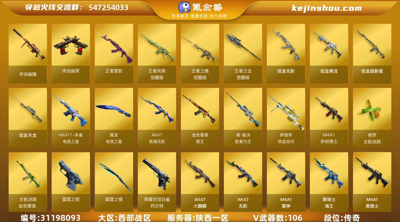 【自带包赔 最高三倍】:西部战区:陕西一区-LV94-上将1-传奇2-106V-6王者-4炫金 【传说武器】:传说幽瞳,传说幽冥 【热门武器】:炽芒蝶刃,G36C-幻影,加特林-炼狱,Kar98K-星神,M200-幻神*2,M200-竞技荣光,M4A1-黑骑士,QBZ03-金色蔷薇*4,RPK-盘龙,Scar Light-白虎,沙鹰-修罗*3,USP-雷暴,传说幽瞳,传说幽冥,柯尔特-荣耀世冠白鲨2023,金色蔷薇-古蛇迷踪,修罗-古蛇迷踪,炽芒蝶刃-破浪逐光 皮肤 【王者炫金武器】:炫金无影,炫金黑龙,炫金超新星,炫金天龙,王者雷影 【音效卡】:QBZ03-金色蔷薇音效卡,Kar98K-星神音效卡 【皮肤】:AWM-天龙-传奇白鲨,白虎-电玩粉兔皮肤,幻神-星火小队签名臻藏版 皮肤,毁灭-荣耀之怒,黑骑士耀金皮肤,金色蔷薇-纸灯龙皮肤,雷神-荣耀之魄,天龙-能量核心,屠龙-荣耀之锋*2,星神-枪娘默 皮肤,幻神-荣耀世冠EP 皮肤,金色蔷薇-破浪逐光 皮肤,裁决-羽掣 皮肤,裁决-叶芒苍灵 皮肤,裁决-胜者为王 皮肤,星神-傲竹金蛇 皮肤,雷神-暗月,毁灭-英雄计划 皮肤,M4A1-千变-孔明皮肤,黑龙-能量核心,无影-能量核心,幻影-破浪逐光 皮肤,AWM-再燃火线,极光-能量核心,修罗-能量核心*3,屠龙-星耀 皮肤,屠龙-破浪逐光 皮肤*4,擎天-傲竹金蛇 皮肤,炽芒蝶刃-破浪逐光 皮肤 【角色】:电竞教官-云悠悠(四防),关小雨(四防),零-水下丽影,晴雅(四防),隼(四防),司雨,王者-魅影(四防),炫,新灵狐者,雨墨(四防),研,王者岚兮儿(四防),王者雨墨(四防),蛇隐宗,乔伊教练,空,灵狐者-黄金海岸,龙儿,潘多拉-甜心教官,蛇姬,新娜塔莎,影武者-X 【人偶武器】:COP-旗袍,M4A1-雷神-精英刀锋,迷你裂空之翼,迷你波特博士,迷你火种,迷你艾比,生化手雷-机甲核心,Scar Light-马枪 【挑战大师】:激光毁灭者III,试炼破坏者III 【...