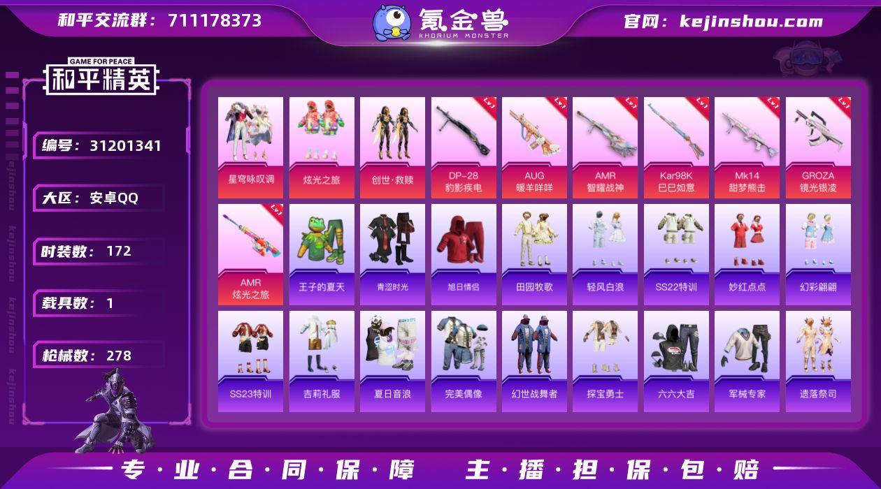 【3粉装8特效枪1载具可秒换绑】 安卓Q区-77815热力值-17印记-172套装-278枪皮 【1载具】 玛莎拉蒂Q蓝色【1稀有】 AWM-黄金龙骨【3粉装】 炫光之旅 创世·救赎 星穹咏叹调【7特效枪】 AMR-炫光之旅(3级) AMR-智耀战神(7级) Mk14-甜梦熊击(5级) GROZA-镜光银凌(5级) Kar98K-巳巳如意(5级) DP-28-豹影疾电(5级) AUG-暖羊咩咩(5级)【45热门】 M416-蓝色火焰 GROZA-异彩先驱 GROZA-彩虹符号 长空猛禽 虚音幻奏 甜心亚梦 沙漠雄狮 牛气冲天 霓虹街区 妙红点点 懵萌河马 S686-奇异狩猎者 军刀雅典娜 英勇保护者 极速红龙 团圆交子 瑞龙福将 白色伏地魔 SS27特训 SS26特训 SS25特训 SS24特训 SS23特训 SS22特训 SKS-怪兽之王 Kar98K-王子的夏天 AKM-环太平洋 SCAR-L-玉兔迎春 GROZA-田园牧歌 M762-天降萌叽 Mk47-乌木金纹 UZI-娇憨猪猪 M416-夜灯 UMP45-蓝色火焰 UMP45-炫光之旅 S12K-垂柳戏鸭 DBS-彩虹符号 M249-彩虹符号 MG3-幻世战舞者 AKM-虎虎生威 AKM-霓虹街区 AKM-星之彼岸【3飞行器】 粉色滑翔尾迹 红色滑翔尾迹 空岛之星尾迹 营地ID:737514080