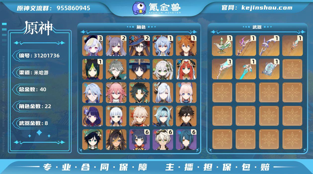 邮箱: 不送邮/死邮 总黄数: 40 冒险等级: 60 3命金色角色: 三命七七 2命金色角色: 二命刻晴,二命莫娜 1命金色角色: 一命达达利亚,一命甘雨,一命提纳里 0命金色角色: 温迪,枫原万叶,优菈,神里绫华,钟离,魈,雷电将军,珊瑚宫心海,申鹤,八重神子,神里绫人,妮露,纳西妲,流浪者,艾尔海森,迪希雅 拥有武器: 天空之翼,飞雷之弦振,四风原典,阿莫斯之弓,天空之刃,天空之脊,千夜浮梦 1精武器: 天空之翼,飞雷之弦振,四风原典,阿莫斯之弓,天空之刃,天空之脊,千夜浮梦