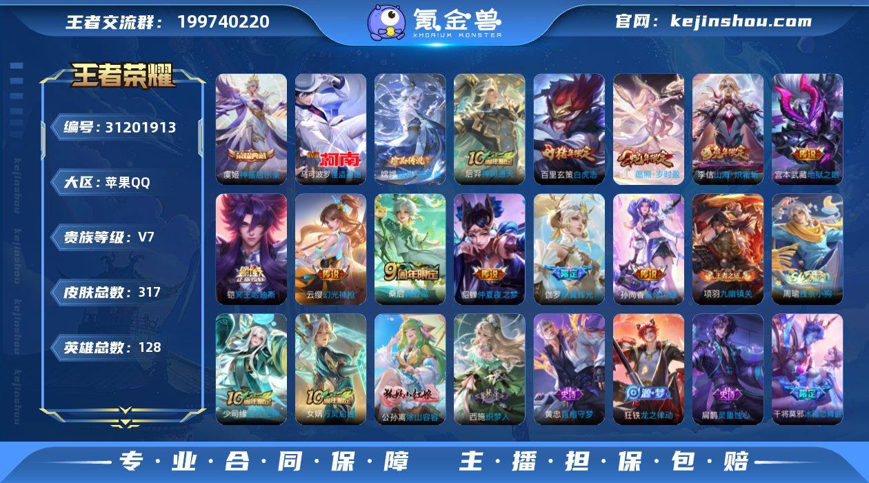 苹果Q-V7-最强王者段位-128英雄-317皮肤-1典藏皮肤-2珍品传说-11传说-96史诗【英雄全皮】:戈娅全皮,空空儿全皮,影全皮【荣耀典藏】:虞姬神鉴启示录【珍品传说】:马可波罗怪盗基德,嫦娥器灵落星盏【传说皮肤】:后羿神树通天,虞姬愿照岁时盈,云缨幻光神枪,桑启鸣野蒿,铠冥王哈迪斯,伽罗炽翼辉光,李信山海炽霜斩,孙尚香音你闪耀,百里玄策白虎志,貂蝉仲夏夜之梦,宫本武藏地狱之眼【限定皮肤】:铠冥王哈迪斯,蒙犽顽岩魄,蔡文姬夏日便利店,大乔绒语心约,虞姬夏日便利店,姜子牙天穹之誓,杨戬破阵退雄兵,狄仁杰阴阳师,赵云皇家上将,妲己时之彼端,嬴政优雅恋人,嬴政白昼王子,庄周高山流水,高渐离死亡摇滚,高渐离玩趣恶龙,钟无艳超时空战士,周瑜赤莲之焰,元歌无心,夏侯惇朔风刀,甄姬游园惊梦,甄姬落雪兰心,马可波罗山海玄木吟,狄仁杰魔术师,狄仁杰万华元夜,达摩沙漠行僧,项羽海滩派对,老夫子醍醐杖,程咬金演武夺筹,兰陵王驯魔猎人,兰陵王金庭之子,孙悟空大圣娶亲,牛魔御旌,后羿圣弓游侠,李元芳云中旅人,虞姬霸王别姬,钟馗神迹守卫,钟馗驱傩正仪,干将莫邪冰霜恋舞曲,干将莫邪胡桃夹子,雅典娜单词大作战,雅典娜黎明之约,蔡文姬繁星吟游,太乙真人华丽摇滚,鬼谷子原初探秘者,鬼谷子五谷丰年,苏烈千军破阵,百里玄策白虎志,百里玄策原初追逐者,百里守约朱雀志,弈星混沌棋,梦奇顽趣,沈梦溪大漠名商,沈梦溪匿光破解者,明世隐疑决卦,裴擒虎李小龙,裴擒虎擒涛扼浪,云中君纤云弄巧,李信山海炽霜斩,伽罗炽翼辉光,盾山御銮,上官婉儿梁祝,嫦娥拒霜思,嫦娥暖冬兔眠,西施玲珑珍味,蒙犽狂想玩偶喵,鲁班大师探海日志,桑启海盐诗旅,暃星界游侠,戈娅驭风魔法,艾琳流音漫舞,司空震地狱燃心,阿古朵江河有灵,张良古海寻踪,蒙犽百解令,蒙恬荣光圣徽,...