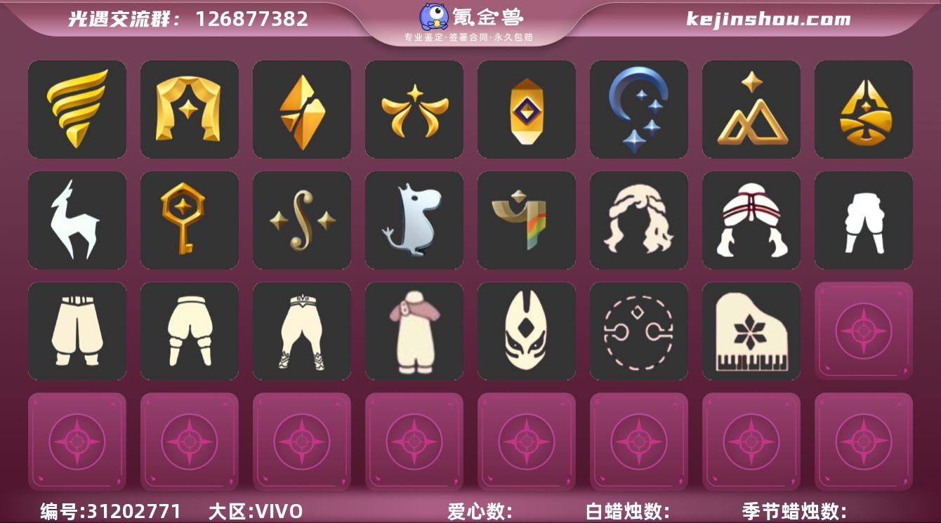 [17178808]安卓官服 邮箱账号 3珍稀物品 15毕业季 6毕业图 7285蜡烛 【珍稀物品】白枭(帝企鹅发),透明蝶翼斗,彩虹围巾(五塑彩带斗) 【季节已毕业】青鸟季,迁徙季,集结季,潜海季,表演季,破晓季,欧若拉季(欧若拉),夜行季,拾光季,归巢季,九色鹿(九色鹿季),筑巢季,二重奏季,姆明季,彩染季 【完成地图】晨岛,云野,雨林,霞谷,墓土(暮土),禁阁 【礼包】青衫落拓礼包,线框斗篷礼包(周年线框斗篷),向日葵连衣裙(连衣裙),兔子鞋(兔子拖鞋),新年裤(瑞气服饰),蝴蝶结(大蝴蝶结),水母(水母肩饰),姆明饰品套装(姆明尾巴),海蓝波浪发型(海洋发型),巫师(巫师帽),橘子(大橘大利),贝壳(贝壳发饰),兔子(玉兔头饰)(玉兔发饰)(兔子发饰),大耳狗发饰(迷你大耳狗发饰),心心相印发饰礼包,四叶草(四叶草头饰),九色鹿角(神鹿祝福头饰)(神鹿祝福礼包),新年耳钉(金鳞耳饰),彩虹耳钉(彩虹耳饰),彩虹耳机,满月耳坠,创始人(创始人斗篷),围巾(小王子斗篷)(小王子围巾),蝙蝠套(蝙蝠斗篷)(南瓜头),蜘蛛斗(蛛丝斗篷)(蛛网斗篷),小提琴(凯旋提琴),献瑞折扇礼包,滑板(冲浪滑板)(冲浪板),小狗周年发饰(小狗周年头饰) 【裤子】筑巢季·裤子(设计师长袍),青鸟尊贵蓬头裤子(蓝色燕尾服),飞天裤(柔缎花边连)(九色鹿丝带裤),妮妮裙子(妮妮长裙),王子服(小王子套装),蓝绿裤(高领舞服),武士裤,背带裤,搓澡巾,击剑裤 【面具】黄眉企鹅面具,夜行毕业面具(棕熊面具),呼吸面具(潜水面具),辉光羚羊面具,贴花面具(丛林黑面具) 【面饰】黑框眼镜(粗框眼镜),青鸟毕业面饰(青鸟面饰),红耳机 【项链】围巾(肩带) 【发型】小王子发型,单侧绑发(单边小辫),海蓝波浪发型,留辫蘑菇头,飞天盘发(九色鹿丸子头),虚荣,归巢毕业发型(五塑彩羽发),若笠(箬笠) 【头饰】平顶帽,蓝色音乐会(蓝色音乐符),行军锅头盔(六边锅帽子)(双耳锅帽子),牛仔帽(西部帽) 【斗篷】冥龙斗篷,燕尾斗篷,黄...