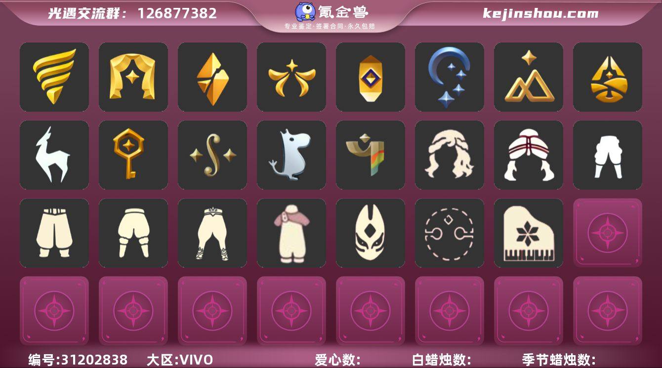 9季9翼透明蝶翼圣诞陆家欧若拉之翼白雪斗篷海洋武士裤 资源:蜡烛 23 爱心 68 红烛 2 翼9 已毕业地图:全图毕业 毕业季节:破晓季 欧若拉季 追忆季 夜行季 拾光季 归巢季 九色鹿季 彩染季 青鸟季 稀有礼包:彩虹帽 蝙蝠套装 巫师帽 绊爱 青衫落拓 橘子发饰 雪花发饰 彩虹耳机 圣诞鹿角 小王子斗篷 欧若拉之翼 瑞雪斗篷 白雪斗篷 雪人斗 狐狸背包 祥云雨伞 热门裤子:背带裤 遥鲲长袍 绑带舞服 奔月长袍 海洋武士裤 白棉裤 搓澡巾 紧身连体衣 武士裤 小丑服 女仆围裙 红色流珠裙 探险燕尾服 兔年套装 热门面具:矮人面具 狐狸面具 黄鼠狼面具 潜海面具 黄眉面具 一字眉 棕熊面具 盲僧眼罩 向导面具 青鸟面具 红脸蛋 龙头 玫瑰花面具 玫瑰面具 黑脸 粽叶面具 鸟羽面具 热门发型:海藻头 爆炸头 大胡子 小飞象 雨妈 卡卡 平菇 龙骨 指甲盖 箬笠 蝴蝶结 公主头 粗辫 水母头 书虫 正太头 高马尾 高马尾 明制帽 绿丝带 虚荣 圆环发辫 留辫蘑菇头 李逍遥发型 彩色脏辫 彩羽发型 兔子头 双辫发型 春丽丸子头 马蹄莲发型 遥鲲发型 彩虹帽 南瓜头 巫师帽 猫猫头 女巫发型 圣诞帽 绊爱发型 光头 青衫落拓发型 热门头饰:尖角牛仔帽 牛仔帽 飞羽发饰 橘子发饰 花环 雪花发饰 蓝色音乐会 晃悠悠 红耳机 辫子发饰 星月头冠 探险耳机 彩虹耳机 圣诞鹿角 热门斗篷:五角星斗篷 红金斗篷 黑金斗篷 白金斗篷 蝴蝶斗篷 汉服斗篷 小王子斗篷 暗花斗篷 冥龙斗篷 遥鲲长斗 展翼圆环斗 欧若拉之翼 透明蝶翼 小浣熊斗篷 毛绒斗 布丁斗篷 布条斗篷 飘带斗篷 国风斗篷 镂空斗篷 镂空三条斗 彩染季围巾斗篷 红色探险斗 星空斗篷 鸟羽斗篷 新春福娃斗篷 樱花斗篷 地球日斗篷 海洋...