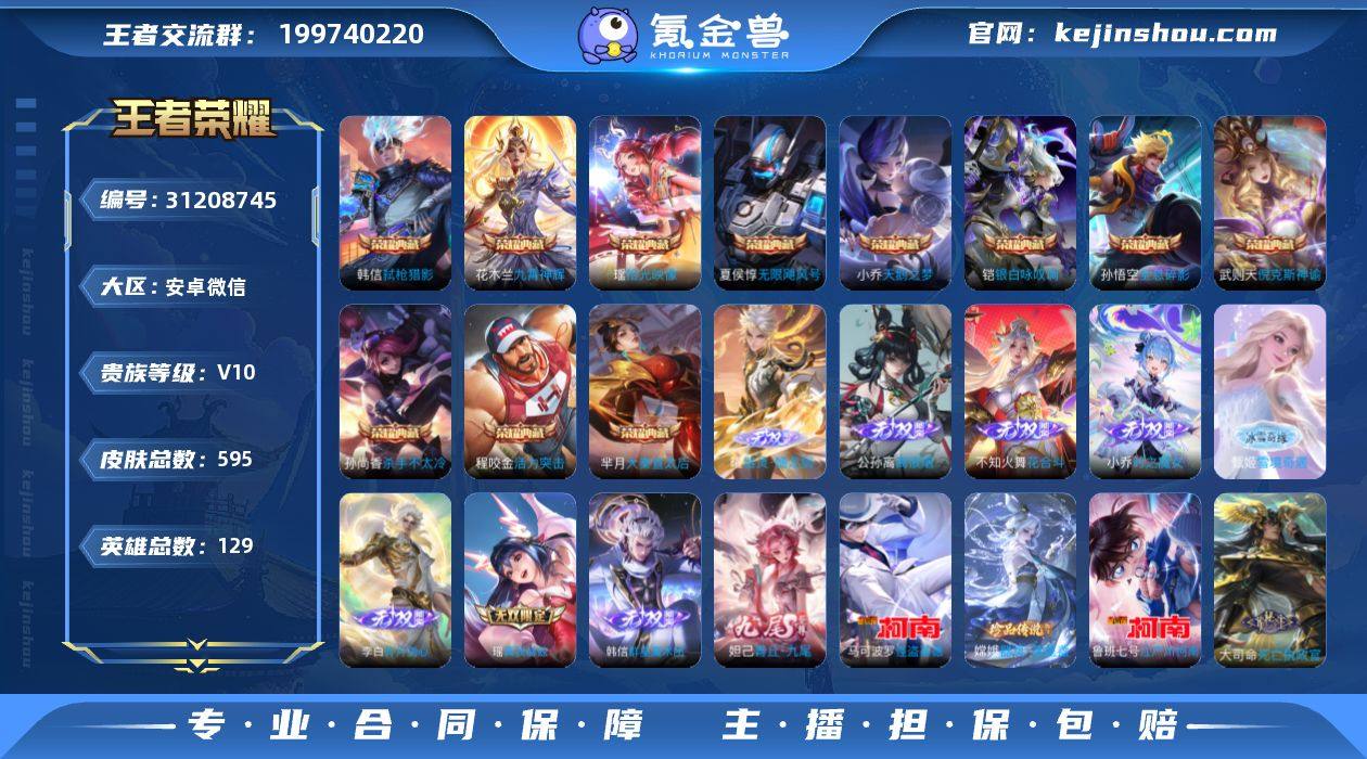 【1小兵,12典藏,9无双,3珍品,91传说,幸运值287】实名: 可修改 性别: 女号 贵族等级: V10 英雄数: 129 皮肤数: 595 荣耀水晶: 武则天,天鹅之梦,倪克斯神谕,无限飓风号,活力突击,杀手不太冷,大秦宣太后,全息碎影,九霄神辉,银白咏叹调,弑枪猎影,拾光映像 无双皮: 真我赫兹(瑶),青丘·九尾,碎月剑心,小乔时之魔女,韩信群星魔术团,花合斗,离恨烟,雪境奇遇-甄姬,器灵·螭龙剑 珍品传说: 江户川柯南,怪盗基德,器灵·落星盏 传说皮: 黄金狮子座,黄金射手座,冠军飞将,云鹰飞将,黄金白羊座,久胜战神,炽阳神光,一念神魔,云霓雀翎,末日机甲-孙尚香,地狱火,仲夏夜之梦,海洋之心,地狱之眼,飞鸢探春,音你心动-周瑜,胖达荣荣,乞巧织情,时之恋人-刘备,游龙清影,淬星耀世,超时空战士-狄仁杰,遇见胡旋,末日机甲-孙策,花朝如约,挚爱之约,挚爱花嫁,无双飞将,音你闪耀,碎云,神器·狴犴令,山海·炽霜斩,山海·琳琅生,山海·苍雷引,浮生妄,灼幽烈阳,鹤归松栖(云缨),遇见神鼓,永恒水手月亮,夜礼服假面,小动物乐团,霜月吟,澜逐花归海,艾琳觅芳踪,落雪白狼,金乌负日,黄金天蝎座,云中君群星魔术团,朵莉亚心动手记,铠冥王哈迪斯,牧神诗旅,玄雷天君,幻光神枪,星之鸣奏,九山相柳,死亡执政官,神树通天 限定皮: 遇见飞天,李小龙,祈雪灵祝,梁祝,时雨天司,龙胆,武圣,烈魂,魔法小厨娘,异界灵契,玄嵩,白晶晶,虎魄,天魔缭乱,神威,永曜之星,飞衡,太华,天狼征服者,热情桑巴,天狼绘梦者,凤求凰,寅虎·御盾,白虎志,青龙志,朱雀志,如梦令-嫦娥,至尊宝,一生所爱,如梦令-后羿,大圣娶亲,默契交锋-花木兰,寅虎·瑞焰,高山流水,孙行者,猪悟能,匿光追影者,女儿国国王,寅虎·赤拳,寅虎·心曲,寅虎·展翼,时之祈愿-云中君,时之祈愿-瑶,玉兔公主,启示之音,匿光决锋者,无尽星芒,深海之息,唐三藏,前尘镜,枫霜尽,匿光启智者,星穹之声,五谷丰年,绯月行,神器·万象笔,天降福星,梦圆繁...