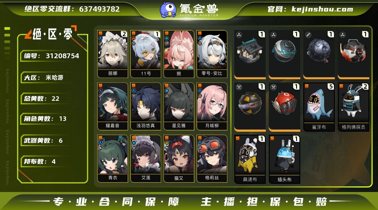 冒险等级:57 总黄数:22 五星角色数:13 菲林底片数量:0 菲林数量:116 加密母带数量:0 2命丽娜,1命「11号」,0命照,0命零号·安比,0命耀嘉音,0命浅羽悠真,0命星见雅,0命月城柳,0命青衣,0命艾莲,0命猫又,0命格莉丝,0命珂蕾妲 6命苍角,6命派派,6命比利,6命安比,6命妮可,6命安东,6命可琳,5命露西,5命本,2命潘引壶,1命波可娜,1命赛斯 1精霰落星殿,1精时流贤者,1精啜泣摇篮,1精嵌合编译器,1精硫磺石,1精钢铁肉垫 5精鲨牙布,2精格列佛探员,1精飚速布,1精插头布 狡黠甜心,漪光夜曲