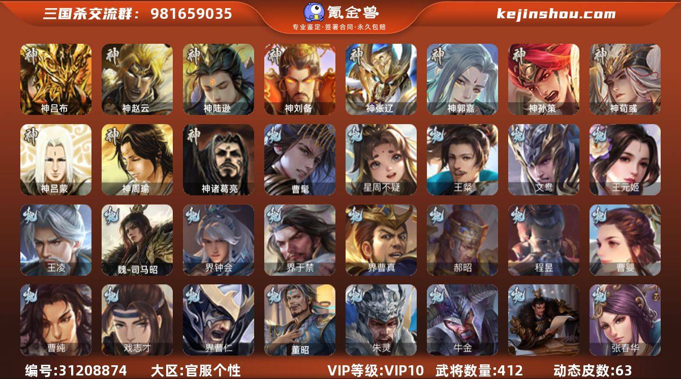VIP等级: VIP13 官阶: 大将军 武将数量: 399 动态皮肤数量: 38 神将: 神甘宁,神郭嘉,神陆逊,神孙策,神张辽,神赵云,神吕蒙,神周瑜,神诸葛亮 魏国武将: 戏志才,曹纯,曹婴,陈琳,程昱,嵇康,界于禁,界钟会,马钧,司马师,王元姬,文鸯,羊徽瑜,杨修,王粲,唐咨-魏,张辽,SP蔡文姬,SP曹仁,SP关羽,SP贾诩,SP姜维,SP庞德,卞夫人,曹昂,曹操,曹冲,曹洪,曹丕,曹仁,曹叡,王异,张恭,鲁芝,界满宠,曹休,界曹植,满宠,荀攸,王基,钟繇,蒯越蒯良,郭嘉,荀彧,阮慧,杜畿,界郭嘉,崔琰,界曹丕,界荀彧,朱灵,界甄姬,辛毗,吕虔,界陈群,界王异,界许褚,界郭淮,华歆,陈群,界邓艾,界典韦,袁涣,李通,乐进,辛宪英,郭淮,郭皇后,毌丘俭,夏侯惇,曹植,司马朗,谋于禁,界曹操,许褚,界张辽,谋徐晃,张郃,钟会,文聘,曹彰,界夏侯惇,诸葛诞,司马懿,甄姬,杨阜,界徐晃,徐晃,孙资刘放,韩浩史涣,曹真,典韦,界夏侯渊,夏侯渊,李典,于禁,王双,邓艾,界司马懿,张春华,孟达-魏,臧霸,牛金,朱灵(国战),SP司马昭,董昭 蜀国武将: 花鬘,界黄忠,沙摩柯,张星彩,赵襄,诸葛瞻,谋马超,谋赵云,马云騄,徐庶,界魏延,杨仪,吕凯,界关羽,界诸葛亮,邓芝,界伊籍,费祎,严颜,界黄月英,界张嶷,赵云,张松,彭羕,李丰,界刘备,界刘禅,谋姜维,刘封,糜竺,黄月英,刘巴,关羽,吴懿,界廖化,向宠,祝融,张飞,黄皓,魏延,界周仓,马忠,界法正,糜夫人,界孟获,刘禅,界赵云,谋诸葛亮,界姜维,张翼,关银屏,界祝融,SP孙尚香,SP徐庶,卧龙诸葛,宗预,周仓,简雍,界关兴张苞,诸葛亮,孙乾,界张飞,界卧龙诸葛,法正,赵统赵广,陈到,界马岱,关平,马岱,界庞统,庞统,诸葛果,马谡,马超,廖化,关兴张苞,孟获,秦宓,吴苋,夏侯氏,姜维,黄忠,刘备,界马超,李严,马良,傅肜,蒋琬费祎,刘谌,彭羕(国战),甘夫人,蜀-糜芳傅士仁 吴国武将: 贺齐,界步练师,界徐盛,界朱然,留赞,骆统,吴景,文鸯,潘濬,陆绩,周泰,全琮,吕蒙,诸葛恪,界孙尚香,界顾雍,大乔小乔,...
