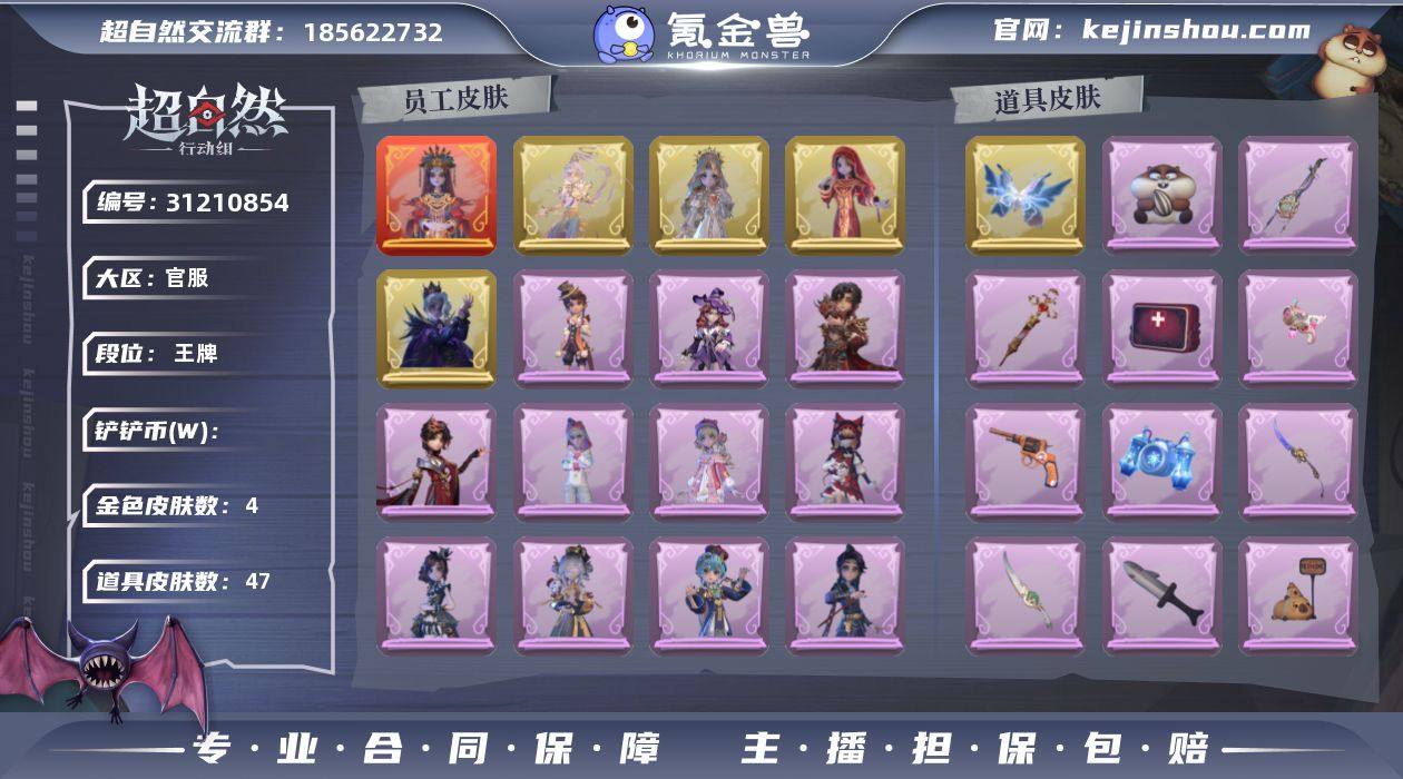 红色皮肤数量:1 金色皮肤数量:4 紫色皮肤数量:23 道具皮肤数量:47 镜生遗梦 莲华渡,圣光之谕,镜花辞,渡鸦公爵 卖家说:四队大情号,不议价
