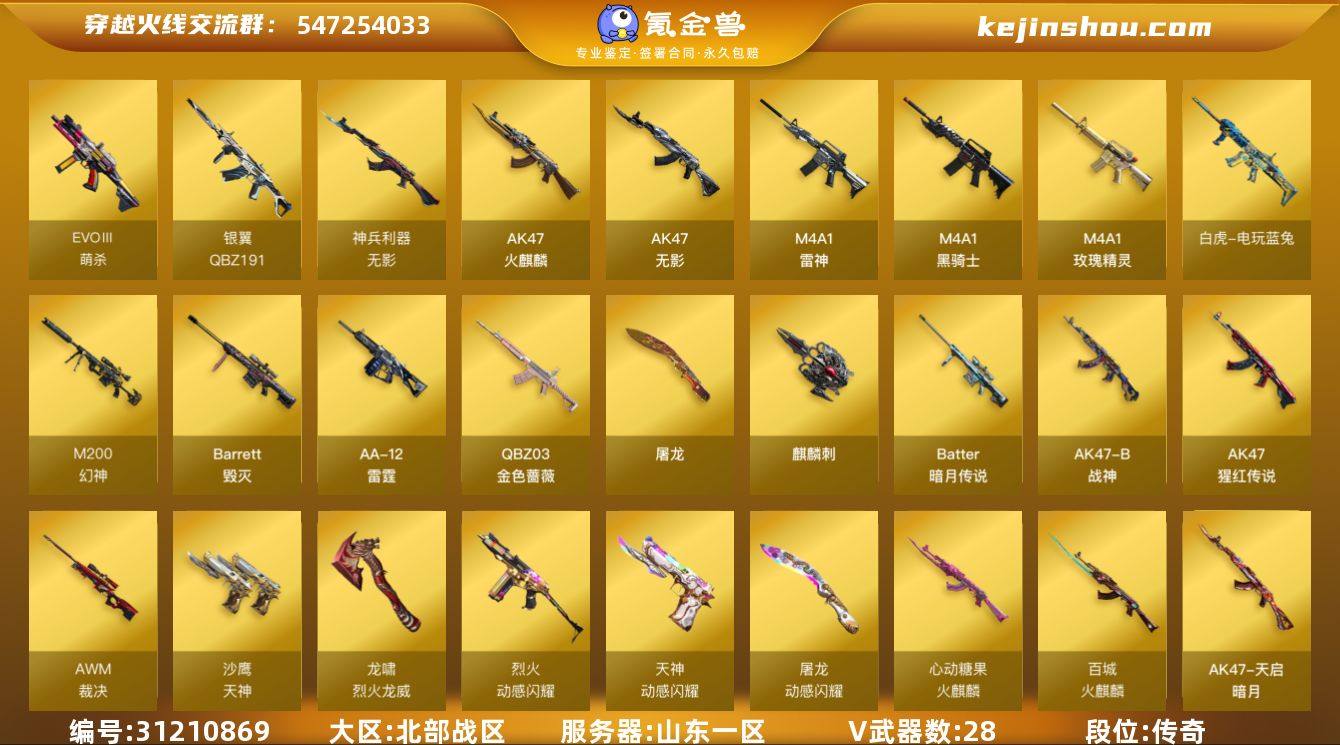 五烈龙 幻神+皮肤 银翼19毁灭/Barrett-暗月传说(2)/AWM-裁决/M4A1-雷神/M4A1-黑骑士/M4A1-玫瑰精灵/白虎-电玩蓝兔/AK47-火麒麟(2)/AK47-无影(3)/无影-神兵利器/AK-47-猩红传说(2)/AK47-B-战神/QBZ03-金色蔷薇/烈火-动感闪耀/汤姆逊-烈龙(5)/AA-12-雷霆/天神-动感闪耀/沙鹰-天神/沙鹰-修罗/麒麟刺/屠龙-动感闪耀/屠龙/手雷-动感闪耀/QBZ191-银翼游侠/龙啸-烈火龙威 【王者武器】 【小人枪】M4A1-雷神-精英刀锋/Scar Light-马枪/AWM-灵狐-15周年嘉年华/COP-旗袍/迷你火种(2)/迷你救赎猎手/步枪-梨花/9A91-2017万圣节/Barrett-苍龙/Barrett-黑大圣/巴雷特-情人节2020/AWM-卡通/AWM-蓝水晶-枪王排位/手雷-能量核心 【重要武器皮肤】M200-幻神-黄忠皮肤/毁灭-黑大圣皮肤/极光-能量核心/裁决-羽掣 皮肤/火麒麟-CFSTAR/火麒麟-心动糖果/火麒麟-百城/无影-暗月/无影-能量核心/AK47-B-常胜将军-孙权/AK47-B-常胜将军-曹操/黑骑士-幻能朋克皮肤/天启-暗月/战神-流金岁月皮肤/战神-紫绶金章皮肤/修罗-CFSTAR/修罗-能量核心/天神-暗月 【重要光效】AN94-超新星蓝色光效/巴雷特-毁灭蓝色光效/RPK-盘龙蓝色光效/汤姆逊-烈龙蓝色光效 【重要音效卡】M4A1-雷神音效卡/M4A1-黑骑士音效卡/AK47-火麒麟音效卡//