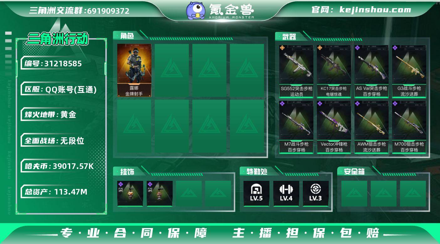 实名:不可二次实名 总资产:113.47M 哈夫币:39017.57K 烽火地带段位:黄金 烽火地带等级:60 全面战场段位:无段位 全面战场等级:1 5级仓库,4级训练中心,3级靶场,0级潜水中心,0级收藏室
