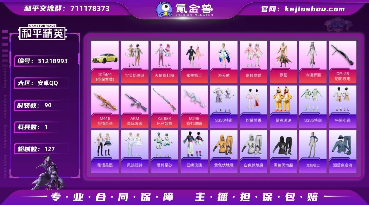 【kyhp740】安卓 手Q-1神装-10粉装-13特效枪-1载具-8粉色飞行器-83565热力值-11王牌印记-179套装-243枪皮 【红色神装等级】:辉羽雀灵-初翊(二级) 【红色角色神装】:辉羽雀灵-初翊 【热门品类】:粉装-繁龙极客,套装-奇异狩猎者,套装-龟仙人,角色-Mark.06 【粉色套装】:粉装-俏皮狐尾,粉装-莲影清波,粉装-繁龙极客,套装-创世·救赎,角色-萨利娅,粉装-绯果甜心,粉装-星穹咏叹调,粉装-幻彩电音,角色-狂魇小丑 【粉色枪皮等级】:SCAR-L-锦绣绵绵(五级),M416-电玩时刻(五级),GROZA-镜光银凌(五级),AUG-暖羊咩咩(五级),AUG-圣斗士星矢(五级),UMP45-量子极限(五级),P90-冷漠罗丽(五级),Kar98K-巳巳如意(五级),Kar98K-圣域龙灵(三级),Mk14-爆裂游戏(五级),MG3-辉羽雀灵(三级),PKM-守护天翼(七级),破片手榴弹-瓶中星球(三级) 【粉色载具】:辉羽雀灵自行车 【粉色枪皮】:SCAR-L-锦绣绵绵,M416-电玩时刻,GROZA-镜光银凌,AUG-暖羊咩咩,AUG-圣斗士星矢,UMP45-量子极限,P90-冷漠罗丽,Kar98K-巳巳如意,Kar98K-圣域龙灵,Mk14-爆裂游戏,MG3-辉羽雀灵,PKM-守护天翼,破片手榴弹-瓶中星球 【粉色飞行器】:齐天大圣飞行器,镜光幻境飞行翼,圣域金龙飞行器,雀灵庇佑飞行器,御兔特攻飞行器,时光之吻飞行器,终晖之翼飞行器 【粉色降落伞】:阿狸红降落伞,齐天大圣降落伞,江南烟雨降落伞,精灵梦叶罗丽降落伞,墨龙九天降落伞,鬼刀降落伞,星穹咏叹调降落伞,辉羽雀灵降落伞,幻彩电音降落伞,时光之誓降落伞,双重狂想降落伞,冷漠罗丽降落伞,荧海星豚降落伞,绯穹魔姬降落伞 【稀有套装】:套装-龟仙人,套装-巳巳如意,套装-雏菊兔兔,套装-萝兰蝴蝶,套装-小熊娃娃,套装-糖糖葫芦,套装-青团波波,角色-都市丽猫,套装-燕燕于飞,套装-鱼渊荷华,套装-旋风灵鼠,套装-樱梦幻音,套...