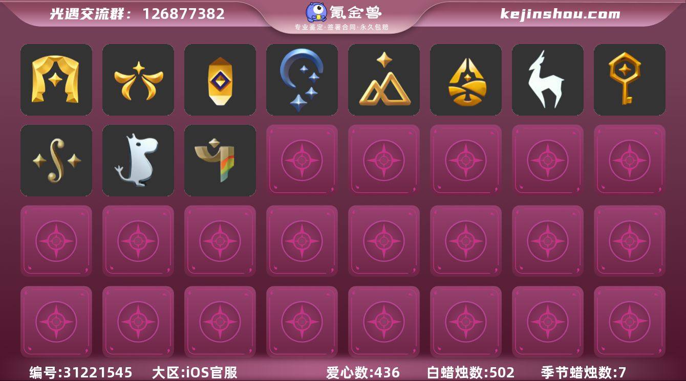 蜡烛数量:502 爱心数量:436 季节蜡烛数量:7 翼数量:12 表演季,欧若拉季,追忆季,夜行季,拾光季,归巢季,九色鹿季,筑巢季,二重奏季,姆明季,彩染季 卖家说:【渠道:ios官服手机号 基础:全图毕业 季节:表演季毕业200欧若拉毕业150追忆季毕业100夜行季毕业100拾光季毕业100归巢季毕业150九色鹿毕业150筑巢季毕业120二重奏毕业120姆明季毕业150彩染季毕业100 复刻:70 活动:70 礼包:祥云裤40蝴蝶结18姆明尾巴45水波发30彩虹帽40蝙蝠120巫师45绊爱100橘子3雪花3兔子3四叶草3星月18神鹿角60耳钉9枯角35鹿角45创始人18欧之翼100白绒45白吉他50欧之声45祥云伞55秋千75茶壶75