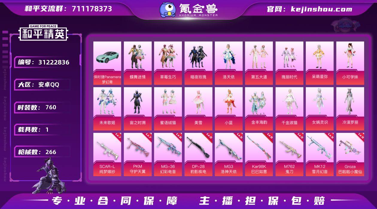 漂亮公主号-洛天依-第五大道-女娲灵识-千金淑猫-红眼罩-浪漫波比-18粉9特1车实名: 可修改 时装数: 760 载具数: 1 枪械数: 266 战备数: 216 热门装扮: 蝶舞迷情,浪漫波比,草莓生巧,黄金大亨,暗夜玫瑰,洛天依,第五大道,瑰丽时代,小可学妹,呆萌星弥,未来歌姬,暗夜魅影,宙之时溯,蜜语绒猫,美雪,小蓝,金丰海韵,千金淑猫,女娲灵识,冷漠罗丽 载具: 保时捷Panamera(梦幻青) 稀有枪皮: MG3洛神天依,SCAR-L纯梦嫁纱,PKM-守护天翼,Kar98K-巳巳如意,M762-鬼刀,MK12-雪月幻音,MG-36-幻彩电音,DP-28-豹影疾电