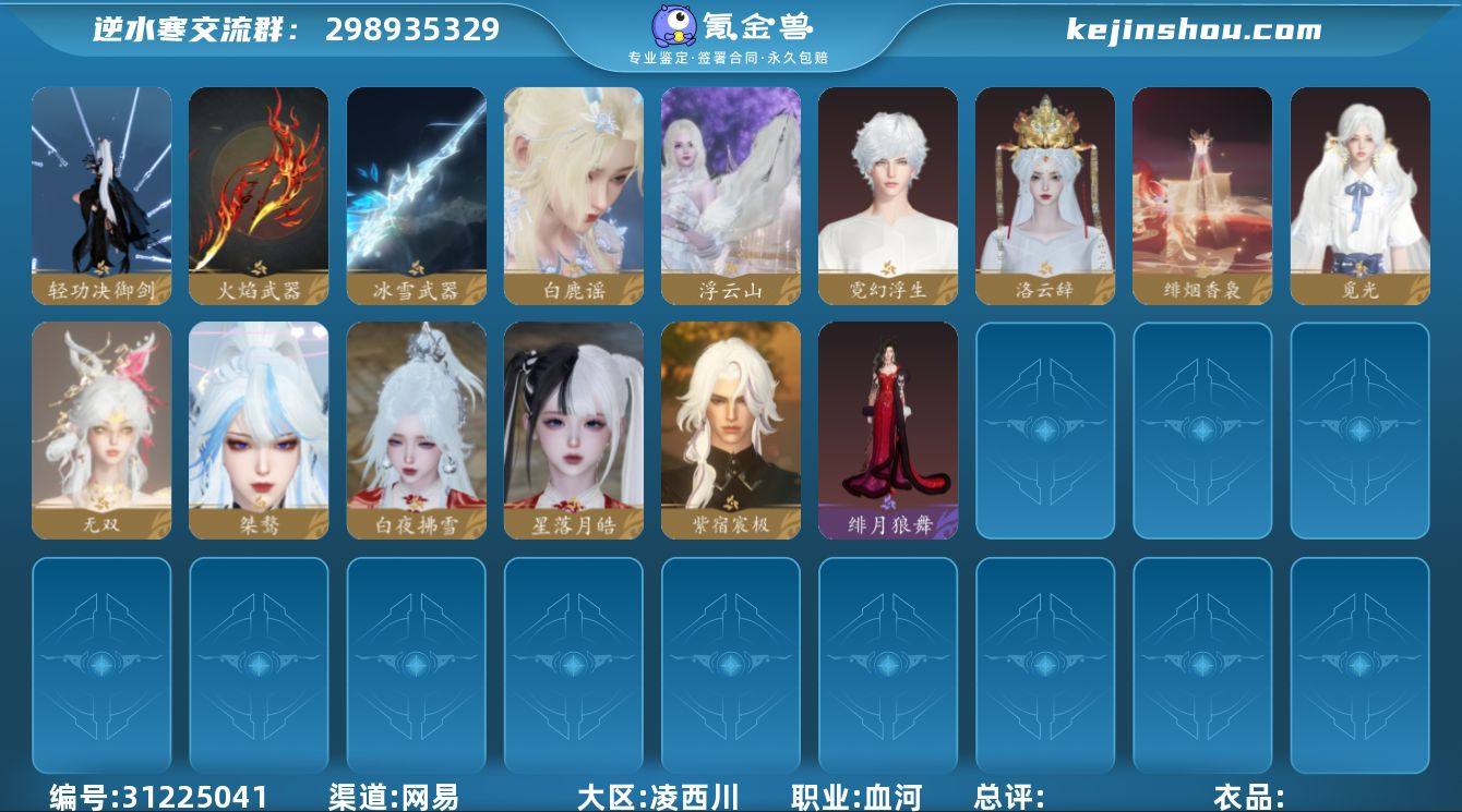 区服】 天府之国 【战力值】 125.49 【职业】 血河 【馆藏】 5级 【衣品值】 223485 【国色值】 76700 【已用天赏石】 16 【天霓染数量】 2 【充值称号】 把酒临风 【累计充值】 12683元 稀有外观: 白夜拂雪,星落月皓,紫宿宸极 天赏石外观: 白发白鹿谣,火焰武器,轻功决·御剑,金发浮云山,冰雪武器,桀骜,无双,觅光,绯烟香袅(礼盒),洛云辞,霓幻浮生,勿忘我 商城时装: 绯月狼舞