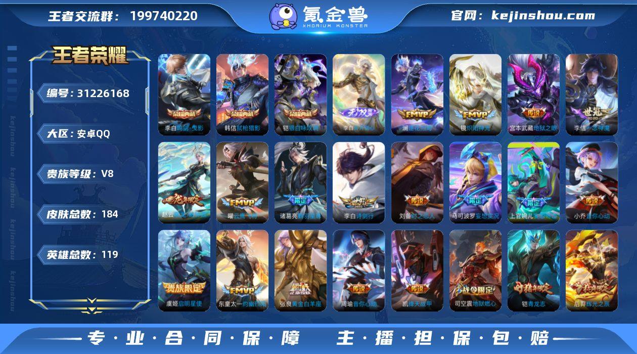CHC10908,小国铠,安卓Q-V8-永恒钻石I段位-119英雄-184皮肤-3典藏皮肤-1无双-17传说-48史诗 【荣耀典藏】:李白鸣剑曳影,铠银白咏叹调,韩信弑枪猎影 【无双皮肤】:李白碎月剑心 【传说皮肤】:赵云乘龙铭钟鼎,澜逐花归海,上官婉儿妄想奇谈,马可波罗妄想实况,东皇太一灼幽烈阳,诸葛亮鹤羽星尊,李白诗剑行,周瑜音你心动,小乔音你心动,铠绛天战甲,镜炽阳神光,虞姬启明星使,曜云鹰飞将,李信一念神魔,刘备时之恋人,张良黄金白羊座,宫本武藏地狱之眼 【限定皮肤】:狄仁杰阴阳师,赵云皇家上将,马可波罗妄想实况,狄仁杰魔术师,项羽海滩派对,后羿辉光之辰,李元芳匿光侦查者,虞姬启明星使,诸葛亮鹤羽星尊,铠青龙志,裴擒虎擒涛扼浪,云中君纤云弄巧,上官婉儿妄想奇谈,西施玲珑珍味,鲁班大师探海日志,桑启海盐诗旅,戈娅驭风魔法,艾琳流音漫舞,司空震地狱燃心,张良古海寻踪,高渐离燃音魔法,妲己灵卜魔法,鬼谷子天穹祈灯,李白碎月剑心,伽罗琥珀纪元,赵云乘龙铭钟鼎,刘邦剑破天穹,程咬金群星魔术团 【年限皮肤】:后羿辉光之辰,铠青龙志,赵云乘龙铭钟鼎 【赛季限定】:桑启海盐诗旅,裴擒虎擒涛扼浪,鲁班大师探海日志,张良古海寻踪,鬼谷子天穹祈灯,刘邦剑破天穹 【战令限定】:戈娅驭风魔法,西施玲珑珍味,司空震地狱燃心,艾琳流音漫舞,高渐离燃音魔法,妲己灵卜魔法 【史诗皮肤】:鲁班七号电玩小子,阿轲暗夜猫娘,赵云皇家上将,赵云未来纪元,貂蝉圣诞恋歌,甄姬冰雪圆舞曲,王昭君偶像歌手,狄仁杰魔术师,廉颇地狱岩魂,宫本武藏鬼剑武藏,孙尚香水果甜心,嬴政暗夜贵公子,妲己魅力维加斯,妲己女仆咖啡,墨子金属风暴,吕布圣诞狂欢,刘禅绅士熊喵,曹操幽灵船长,张飞乱世虎臣,花木兰水晶猎龙者,夏侯惇乘风破浪,小乔缤纷独角兽,兰陵王暗隐猎兽者,亚瑟心灵...