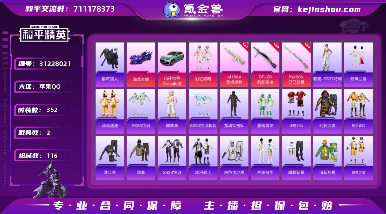 热力值:34268 载具数:2 时装数:352 枪械数:116 战备数:77 游戏等级:55 卓越印记:0 传奇印记:0 绝世印记:0 彩虹甜喵 七级M16A4-垂柳戏鸭,五级DP-28-豹影疾电,五级Kar98K-巳巳如意 海龙奔腾,玛莎拉蒂Grecale(薄荷绿) 垂柳戏鸭降落伞,忍者神龟降落伞,时空协奏降落伞,太空嘟嘟降落伞 SS37特训,粉黛兰香,萌鸡速递,SS35特训,懒羊羊,SS34特训套装,冰冻风暴,缤纷果语,冰河战士,白色伏地魔,长空猛禽,蝶变,都市丽猫,都市猎人,绯格组合,疯狂小兔子,飞行日记,光之冒险,海岛探路者,荷畔雨呱,黑色伏地魔,黄色伏地魔,黄色运动,红色运动,幻世战舞者,幻影武者,娇憨猪猪,竞技名士,街头潮人,街头风暴,酷潮明星,空岛之星,龙的传人,龙魂突击队,蓝色运动,林月如,冷焰舞者,漫步者,猛禽,萌黄之夏,魅力单车,麻辣教官,萌趣咩咩,霓虹街区,柠萌假日,牛气冲天,牛气满满,破蛋小黄鸡,轻风白浪,青团波波,清新柠檬,青玉碎影,沙漠探路者,SS19特训,SS20特训,SS21特训,SS22特训,SS23特训,SS24特训,SS25特训,SS26特训,SS27特训,SS28特训,SS29特训,SS30特训套装,SS31特训套装,巳巳如意,酸甜橘柚,探宝勇士,特殊使命,糖糖葫芦,田园牧歌,特战装甲,无暇誓言,炫蓝之夏,夏雨游龙,玉兔迎春,鹰眼刺客,鱼渊荷华,耀眼新星,智慧之神,灼焰舞者 燃烧瓶-福马献瑞,AKM-霓彩脉冲,Famas-霓彩脉冲,Mk14-紫晶流影,SLR-霓彩脉冲,破片手榴弹-拽到爆炸,S12K-霓彩脉冲,SCAR-L-彩虹符号,AMR-喜羊羊与灰太狼,爆炸猎弓-喜羊羊与灰太狼,P90-玩趣呆呆,AC-VAL-彩虹甜喵,AC-VAL-天降萌叽,AKM-彩虹符号,AKM-龙的传人,AKM-破晓战魂,AKM-影袭,AKM-灼热熔岩,AUG-耀粉歌者,AWM-垂柳戏鸭,DBS-彩虹符号,DBS-月影灵韵,DP-28-彩虹符号,GROZA-彩虹符号,GROZA-海盐豹豹,GROZA-田园牧歌,GROZA-影袭,Kar98K-彩虹符号,Kar98K-影袭,M16A4-冰河战士,M16A4-幻世战舞者,M200-乌木金纹,M249-彩虹符号,M249-糯团青竹,M249-破晓战魂,M24-炫彩节奏,M24-影袭,M416-绯红前夜,M416-红色方程式,M416-蓝色火焰,M416-糯团青竹,M762-天降萌叽,MG3-幻世战舞者,蜜獾-垂柳戏鸭,蜜獾-精灵梦叶罗丽,蜜獾-天降萌叽,蜜獾-娇憨猪猪,蜜獾-糖糖葫芦,Mini14-耀粉歌者,Mini14-香桃花海,Mk14-冰河战士,MK20-H-狂鲨锋刃,MK20-H-糖糖葫芦,莫辛纳甘-蜜语绒猫,P18C-糖糖葫芦,平底锅-娇憨猪猪,平底锅-糖糖葫芦,平底锅-田园牧歌,破片手榴弹-炽纹蛇影,QBZ-彩虹符号,S12K-垂柳戏鸭,S12K-幻世战舞者,S12K-娇憨猪猪,S12K-破晓战魂,S12K-玩趣呆呆,S1897-炫彩节奏,S686-彩虹符号,S686-红色方程式,S686-奇异狩猎者,S686-生命誓言,SCAR-L-净心行者,SCAR-L-炫彩节奏,SCAR-L-玉兔迎春,SKS-炫彩节奏,SLR-娇憨猪猪,SPAS-12-田园牧歌,SPAS-12-燕燕于飞,汤姆逊-耀粉歌者,UMP45-蓝色火焰,UMP45-糖糖葫芦,UZI-冰河战士,UZI-娇憨猪猪,UZI-啾咪啾咪,UZI-天降萌叽,UZI-影袭,Vector-田园牧歌,Vector-燕燕于飞,V