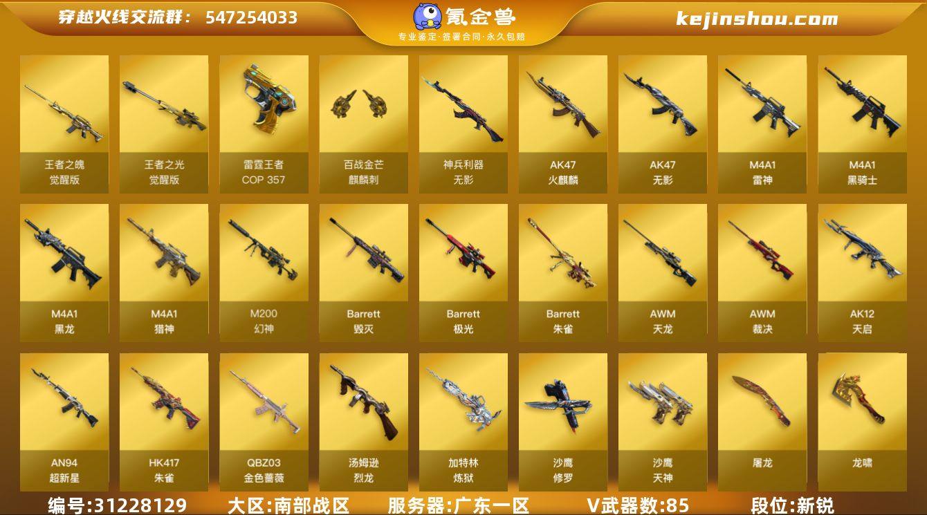 【ky5387】广西一区-93V-15王者武器数-0炫金武器数 【热门武器】:QBZ03-金色蔷薇*3,HK417-朱雀,M200-幻神,M4A1-黑骑士,汤姆逊-烈龙*6,加特林-炼狱*2,羊驼玩偶,火麒麟-绝迹,COP-白鲨,COP 357-雷霆王者,沙鹰-修罗*4,金刚伞 【王者炫金武器】:COP 357-雷霆王者,王者之魄高爆手雷,王者之魄闪光弹*4,王者之魄烟雾弹*2 【音效卡】:AK47-火麒麟音效卡,M4A1-雷神音效卡,M4A1-黑骑士音效卡,Barrett-毁灭音效卡,Barrett-极光音效卡,枪娘语音包-阿敏,Barrett-碧霄极光音效卡,炼狱-百战金芒-庆典舞曲音效卡 【皮肤】:幻神-荣耀世冠EP 皮肤,金色蔷薇-枪娘阿敏 皮肤,QBZ03-荣耀世冠EP 皮肤,裁决-叶芒苍灵 皮肤,烈龙-星空,雷神-暗月,雷神-虎将,雷神-耀金皮肤,M4A1-再燃火线,AK47-火麒麟-传奇EVEN,火麒麟-平天大圣,火麒麟-百城,火麒麟-心动糖果,火麒麟-玉面羞花 皮肤,毁灭-暗月,毁灭耀金皮肤,毁灭-战神张飞,M4A1-千变-孔明皮肤,黑龙-暗月*2,黑骑士-暗月,战神-粉色甜心皮肤*2,战神-紫绶金章皮肤*2,战神-流金岁月皮肤*2,AK47-B-常胜将军-刘备,AK47-B-常胜将军-孙权,极光-能量核心,极光-高能霹雳 皮肤,炼狱-月 皮肤,修罗耀金皮肤,轻型军用手斧-再燃火线,麒麟刺-月皮肤 【角色】:炫,枪娘樱,王者春,王者玲珑-小乔,乔伊教练,炽天使,暗夜-X,风暴女,虎妞,嘉年华灵狐,娟娟,灵狐-花神,灵狐者-X,灵狐者-黄金海岸,龙儿,麻雀,曼陀罗-X,曼陀罗-礼服,潘多拉-X,潘多拉-甜心教官,邱刚敖,青霞仙子,斯沃特-X,蜀雪,铁骑荣耀,雪莉杨,雪莉杨-摸金校尉,影武者-X 【人偶武器】:火麒麟-绝迹,COP-白鲨,街机小灰机,AWM-灵狐-15周年嘉年华,迷你牛牛,迷你生化手雷*2,生化手雷-机甲核心,深渊终结者手雷,闪光弹-小乔,闪光弹-貂蝉,高爆手雷-大乔 【暴走生化】:黑...