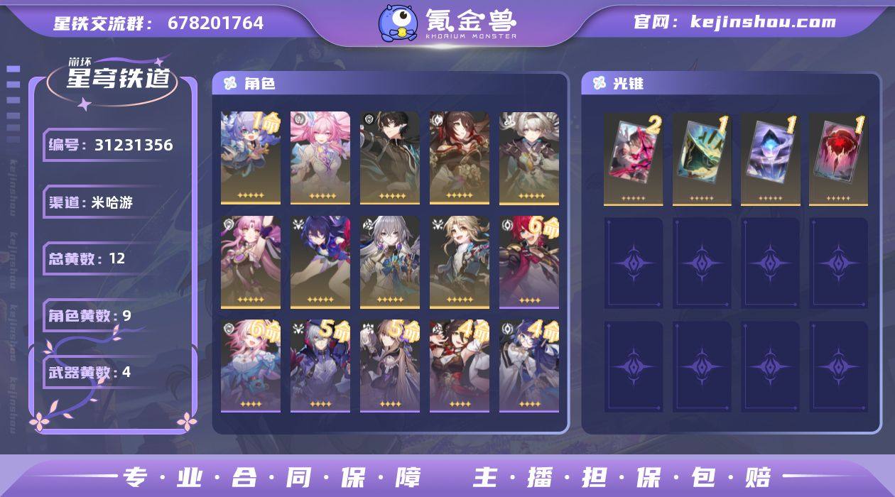 总黄数:12 五星光锥数:4 五星角色数:9 开拓等级:66 开拓者性别:女 星轨专票:0 星琼数量:98 1命白露,0命昔涟,0命丹恒·腾荒,0命忘归人,0命流萤,0命符玄,0命希儿,0命布洛妮娅,0命彦卿 2精以世界之名,1精记忆的质料,1精记一位星神的陨落,1精星海巡航 换绑材料:可提供换绑材料 邮箱状态:未绑定 psn绑定情况:否 taptap绑定情况:否