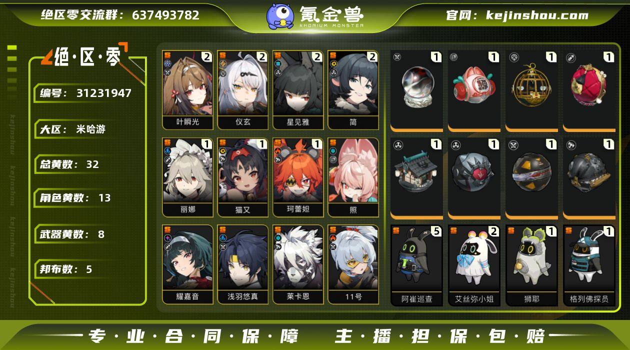 冒险等级:56 总黄数:32 五星角色数:13 菲林底片数量:0 菲林数量:935 加密母带数量:5 2命叶瞬光,2命仪玄,2命星见雅,2命简,1命丽娜,1命猫又,1命珂蕾妲,0命照,0命耀嘉音,0命浅羽悠真,0命莱卡恩,0命「11号」,0命格莉丝 6命潘引壶,6命波可娜,6命赛斯,6命露西,6命苍角,6命本,6命安比,6命妮可,6命可琳,5命派派,5命安东,4命比利,0命真斗 1精半糖雪兔,1精云霓孤光,1精青溟笼舍,1精玲珑妆匣,1精霰落星殿,1精淬锋钳刺,1精硫磺石,1精拘缚者 5精阿崔巡查,2精艾丝弥小姐,1精狮耶,1精格列佛探员,1精巴特勒 狡黠甜心,墨形影踪,暖霞拾光,水晶灯下,漪光夜曲 卖家说:21叶瞬光 21雅 21仪玄 21简 01耀嘉音 01照 双池小保底 三合一池子垫了一点!主线进度2.2还有很多资源肝!叶瞬光 仪玄 耀嘉音有皮肤!