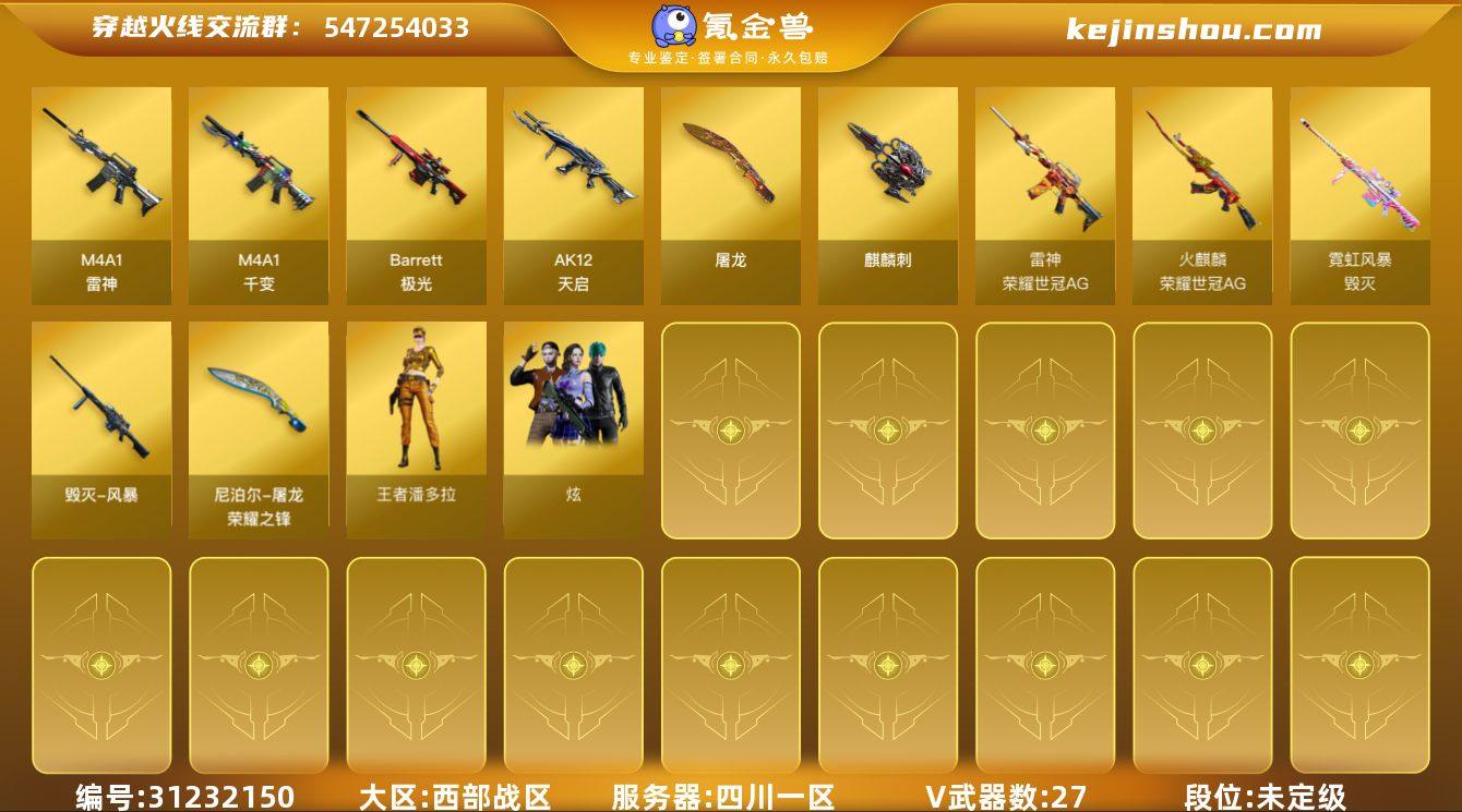 四川一区-30V-2王者-0炫金 【热门武器】:荣耀世冠-柯尔特,羊驼玩偶 【王者炫金武器】:王者森力 【音效卡】:Barrett-碧霄极光音效卡 【皮肤】:雷神-荣耀之魄,雷神-荣耀世冠AG,M4A1-再燃火线,火麒麟-荣耀世冠AG,毁灭-风暴,天启-高能霹雳 皮肤,屠龙-荣耀之锋,轻型军用手斧-再燃火线 【角色】:玄豹,王者潘多拉,乔伊教练,修道士,云海玲珑,芳心审判者,娟娟,龙儿,龙儿-小淘气,潘多拉-甜心教官,甜心偶像,雪莉杨 【人偶武器】:AWM-灵狐-15周年嘉年华,生化手雷-机甲核心 【挑战大师】:冰龙粉碎者-白马银枪 【英雄级武器】:M4A1-千变,M4A1-雷神,AK12-天启*2,SCAR Light-玄豹,Barrett-极光,王者之怒-觉醒版,荣耀世冠-柯尔特,屠龙*2,麒麟刺,麒麟刺-百战金芒,丛林匕首-玄豹,高爆手雷-玄豹*5,闪光弹-玄豹*2,烟雾弹-玄豹*3,M4A1-苍鸣雷神,Barrett-碧霄极光 【道具】:BS战队炫彩背包,炫彩背包,百战金芒炫彩背包,女皇终结者-魔龙之吻,绿色巨人,灵魂忍者,迷雾幽灵,夺命之镰,防化服*3,星辰流光-枪王排位,流光-鎏金之域,语音特效-盛典烟火,萌萌小葵表情,防弹头盔*6,防弹衣*6,C4工具钳*6,手雷包*6 【特殊枪械】: