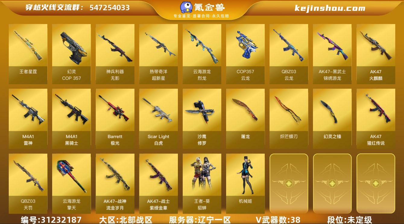 辽宁一区-39V-2王者-0炫金 【热门武器】:Scar Light-白虎,M4A1-青龙,Cat-刀锋,M4A1-黑骑士,COP 357-幻灵*2,沙鹰-修罗*2,炽芒蝶刃 【王者炫金武器】:王者星霆 【音效卡】:Scar Light-白虎音效卡,QBZ03-天罚音效卡 【皮肤】:火麒麟-心动糖果,战神-紫绶金章皮肤*3,战神-流金岁月皮肤,屠龙-星火燎原 【角色】:机械姬,王者-葵-貂蝉,奇洋探员,云海玲珑,飞虎队-X,嘉年华灵狐,灵狐者-X,潘多拉-X,斯沃特-X,蜀雪,新娜塔莎 【人偶武器】:白虎-迷你小艾,AWM-灵狐-15周年嘉年华,Cat-刀锋,迷你牛魔王,生化手雷-机甲核心 【暴走生化】:超级对讲机 【挑战大师】:激光毁灭者III-白马银枪,机甲撕裂者III,试炼破坏者III,神圣爆裂者-末日III 【英雄级武器】:AK47-火麒麟,M4A1-雷神,M4A1-黑骑士,M4A1-青龙,Scar Light-白虎,QBZ03-天罚,无影-神兵利器,QBZ03-云龙,黑武士-锦绣游龙,超新星-热带奇洋,AK-47-猩红传说*4,Barrett-极光,王者风神-觉醒版,烈龙-云海游龙,沙鹰-修罗*2,COP 357-幻灵*2,COP 357-云龙,屠龙*2,幻灵之锋,炽芒蝶刃,擎天-云海游龙,龙啸-热带奇洋,高爆手雷-幻灵*2,高爆手雷-云龙,手雷-云海游龙,手雷-热带奇洋,闪光弹-幻灵*2,闪光弹-云龙,烟雾弹-幻灵,烟雾弹-云龙 【道具】:云山科技背包,云海游龙炫彩背包,全能枪王背包,奇洋探员-海龟背包,热带奇洋炫彩背包,超级背包,哔哩哔哩名片,救世主-黑桃战神,绿色巨人,灵魂忍者,迷雾幽灵,生化弹匣,夺命之镰,防化服*3,金色流光-枪王排位*2,星辰流光-枪王排位,枪王排位28赛季金色流光,枪王排位29赛季金色流光,语音特效-机器人,热带奇洋表情,云海游龙表情,C4-红龙,防弹头盔*8,防弹衣*8,C4工具钳*7,手雷包*7 【特殊枪械】:1白虎,1黑骑士