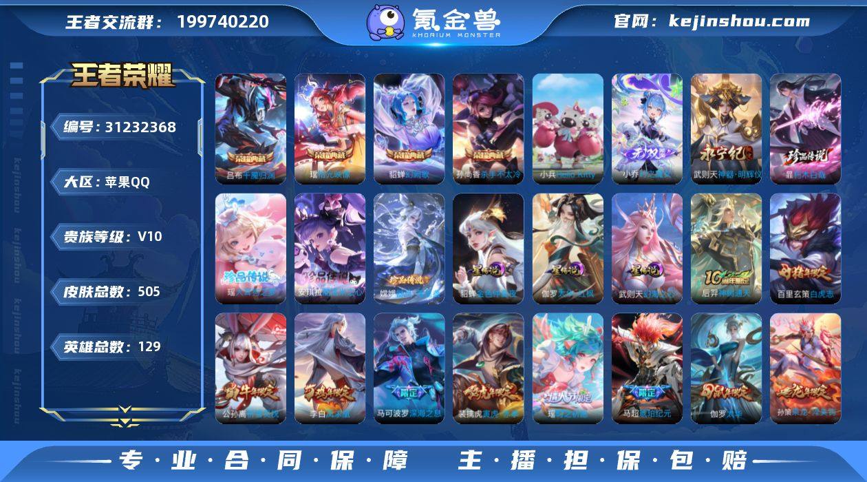 贵族等级:V10 典藏皮肤数:4 珍品无双皮肤数:0 无双皮肤数:2 珍品传说皮肤数:4 传说皮肤数:50 史诗皮肤数:166 皮肤数:505 英雄数:129 段位:星耀 卖家说:带安q和平精英有红装有马皮