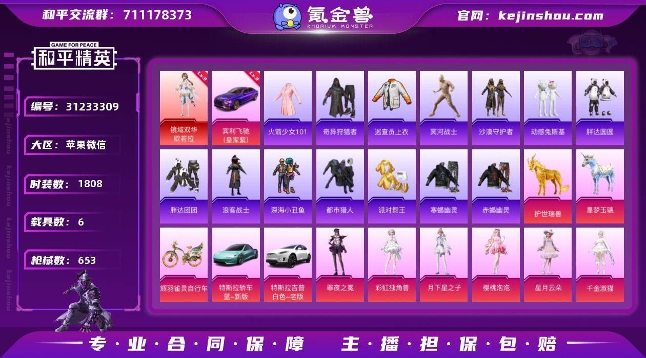 【主播推荐】实名: 不可修改 时装数: 1934 载具数: 17 枪械数: 678 战备数: 413 神级装扮: 沙丘之主-图卡盟,圣域龙灵-瑞拉 热门装扮: 奇异狩猎者,梦幻火箭(新101),蝶舞迷情,古堡领主,幻影战神,甜心巧克力,未来战士,呆萌铁蟹,数码大师,守护骑士,快乐主宰,怪诞乔克,星之信仰,宝贝奶油派,浪漫波比,天使彩虹糖,梦魇先生,火曜朱雀,万圣娃娃,土曜战麒,木曜青龙,金曜白虎,金属狂野,鹰眼刺客,缤纷油彩,狂徒小丑,花面小丑,爱崽白熊,好奇恐龙,甜蜜誓约,都市猎人,载具: 玛莎拉蒂Ghibli(金),玛莎拉蒂Ghibli(粉),双人摩托-梦幻火箭,合金龙骨(绿),合金龙骨(红),空客H135-恋语之翼,快艇-塞莎KL27(霓虹粉),兰博基尼Estoque(尊享铂),兰博基尼Aventador SVJ(尊享铂),兰博基尼URUS(尊享铂),僚机-萌兔起飞,玛莎拉蒂Quattroporte(幻星粉),迈凯伦570S(炫冰蓝),宾利添越(彩虹光),宾利欧陆GT敞篷(深空蓝),照夜玉狮子,糖心拉力赛车(波动紫),星梦玉骢,晶梦灵驹,僚机-圣域龙宝 稀有枪皮: MG3洛神天依,Mini14龙虾霸霸,UMP45雪国精灵,Vector红伞翩翩,M762甜蜜誓约,M24星之信仰,Mini14荧光虫舞,AKM炫紫旋律,Kar98K伏魔团,M416五爪金龙,SCAR-L梦幻火箭,AWM花间之火,DP-28扶摇飞仙,M416心之恋语,Groza香水柠檬,SKS诡面斩,AUG星之彼岸,SLR暗夜玫瑰,M416风花雪月,M249蓝莓炮弹,野牛-流星咚咚,M762甜心娃娃,S12K海渊国主,GROZA焦糖拿铁,SKS-碧影闪光,SCAR-L青春物语,UMP45恐龙拽拽,SCAR-L甜梦小狐,UZI筑梦精灵,M762冷魅冰骑,AWM橘柚倾心,AUG妙趣可丽,M16A4垂柳戏鸭,Vector灵感创作师,M416至情至圣,UMP45玉魂晶魄,P90甜蜜草莓,汤姆逊冰川粉黛,DP-28暗夜鎏金,SCAR-L天蓬元帅,SCAR-L纯梦嫁纱,SPAS-12音爆索尼克,M417第五大道,P90仙履奇缘,AMR炫光之旅,平底锅林间仙鹿,平底锅仲夏莫吉托,爆炸猎弓雪梅暗香,M416超新星,MK14闲梦青缨,DP-28圣堂之誓,P90沙...