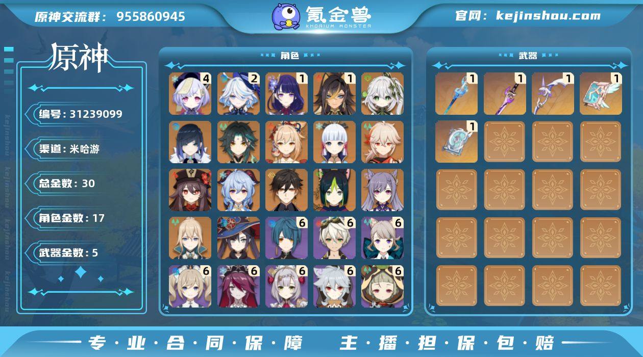 冒险等级:58 总黄数:30 5星角色数:17 5星武器数:5 原石数量:162 纠缠之源数量:14 4命七七,2命芙宁娜,1命雷电将军,1命迪希雅,0命纳西妲,0命夜兰,0命魈,0命宵宫,0命神里绫华,0命枫原万叶,0命胡桃,0命甘雨,0命钟离,0命提纳里,0命刻晴,0命琴,0命莫娜 6命班尼特,6命琳妮特,6命行秋,6命芭芭拉,6命柯莱,6命雷泽,6命罗莎莉亚,6命诺艾尔,6命早柚,5命托马,5命烟绯,4命久岐忍,4命香菱,3命北斗,3命砂糖,2命嘉明,2命夏洛蒂,2命迪奥娜,2命多莉,2命九条裟罗,2命鹿野院平藏,2命米卡,2命瑶瑶,1命菲米尼,1命夏沃蕾,1命安柏,1命珐露珊,1命凯亚,1命坎蒂丝,1命凝光,1命辛焱,1命云堇,0命卡齐娜,0命绮良良,0命重云,0命卡维,0命丽莎,0命莱依拉,0命五郎 精1静水流涌之辉,精1雾切之回光,精1阿莫斯之弓,精1天空之卷,精1四风原典 100%侦察骑士,古恩希尔德的传承,花时来信,倩影游侠,星与月之约,雨化竹身,叶隐芳名,致教会自由人 卖家说:诚心出号
