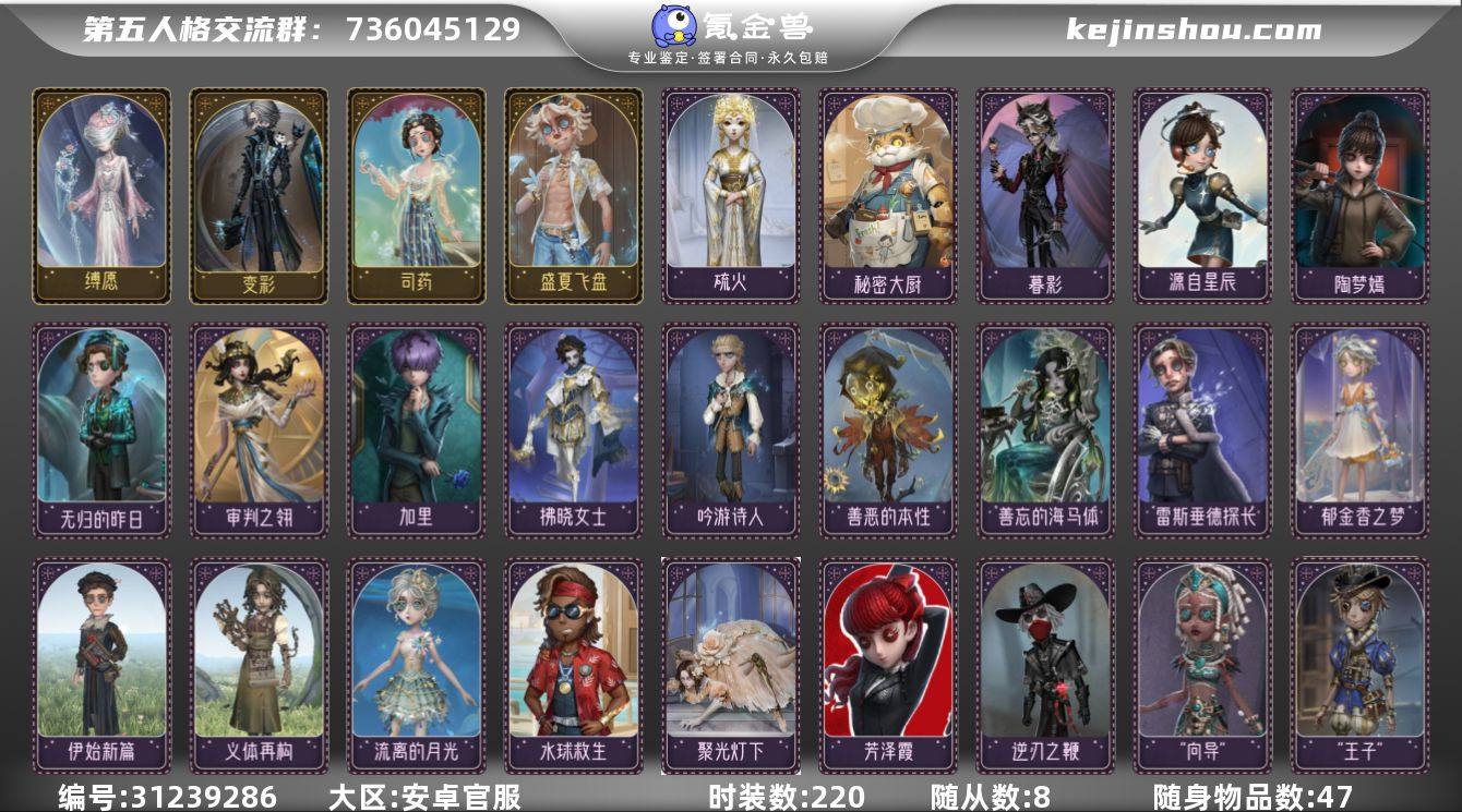 阅历等级:32 时装数:220 虚妄杰作时装数:0 稀世时装数:4 奇珍时装数:35 随从数:8 稀世随从数:0 奇珍随从数:0 随身物品数:47 虚妄杰作随身物品数:0 稀世随身物品数:3 奇珍随身物品数:13 角色数:29 昆虫学者-缚愿,入殓师-变彩,医生-司药,勘探员-盛夏飞盘,红蝶-硫火