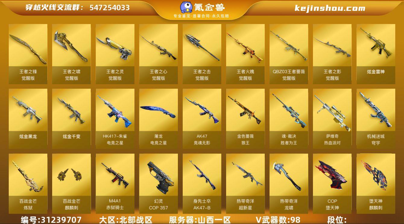 北部战区(山西一区)lb【小极品爆破号】98v【M200-幻神套+三皮/AG-CFPLS17冠军/荣耀世冠白鲨2023/星耀,Kar98k-星神,幻灵套装,堕天神套装,热带奇洋套装,QBZ03-金色蔷薇套+双皮/电竞之星/热带奇洋,ScarLight-白虎+皮/暗星,AWM-裁决+三皮/胜者为王/运输船/羽擎,炽芒蝶刃,QBZ03-王者蔷薇,6烈龙+4炼狱+斯泰尔-蝴蝶,COP-堕天神*3,COP357-幻灵,柯尔特-荣耀世冠白鲨2023,Colt1911-大黄蜂,猫猫手套,金刚伞】11王者【QBZ03-王者蔷薇,王者之心,王者之影,王者火魄,王者之灵,王者之锋,王者之击,王者之啸,炼狱-悦蓝】5炫金【炫金黑龙,炫金雷神,炫金骑士,炫金千变】15角色【四防影豹,四防王者玲珑-小乔,四防王者-葵-貂蝉,四防王者涂鸦,迷迭香,魅影,零·纪元,战地猎狐,幻面灵狐,葵-阿尔法武装,奇洋探员,乔伊教练,蛇隐宗,修道士,雪域霜狐】12音效【M200-幻神音效卡,QBZ03-金色蔷薇音效卡,70KG语音包,绝迹语音包,AK47-火麒麟音效卡,M4A1-雷神音效卡,炼狱-百战金芒-庆典舞曲音效卡,M4A1-黑骑士音效卡,屠龙-电竞之星-竞星跃动音效卡,HK417-朱雀-电竞之星-竞星跃动音效卡,Barrett-毁灭音效卡】41皮【幻神-星耀,幻神-AG-CFPLS17冠军,幻神-荣耀世冠白鲨2023,裁决-羽擎,裁决-运输船,裁决-胜者为王,金色蔷薇-电竞之星,ScarLight-白虎-暗星,金色蔷薇-热带奇洋,火麒麟-白虎,毁灭-风暴,屠龙-破浪逐光,传奇石头-横秒之巅,雷神-杨戬,毁灭-星空,毁灭-AG-CFPLS15冠军,屠龙-巅峰荣耀,火麒麟-心动糖果,炼狱-星空,火麒麟-CF STAR,屠龙-荣耀之锋,毁灭-冠军之怒,火麒麟-轻羽,毁灭-SV-CFPLS16冠军,毁灭-CFS2020,火麒麟-平天大圣,雷神-神秘按键】小人物枪【HK417-朱雀-蛇隐宗,雷神-小红,COP-白鲨,斯泰尔-蝴蝶】挑战枪【机甲撕裂者III,试炼破坏者III】VIP6 截图展示段位...