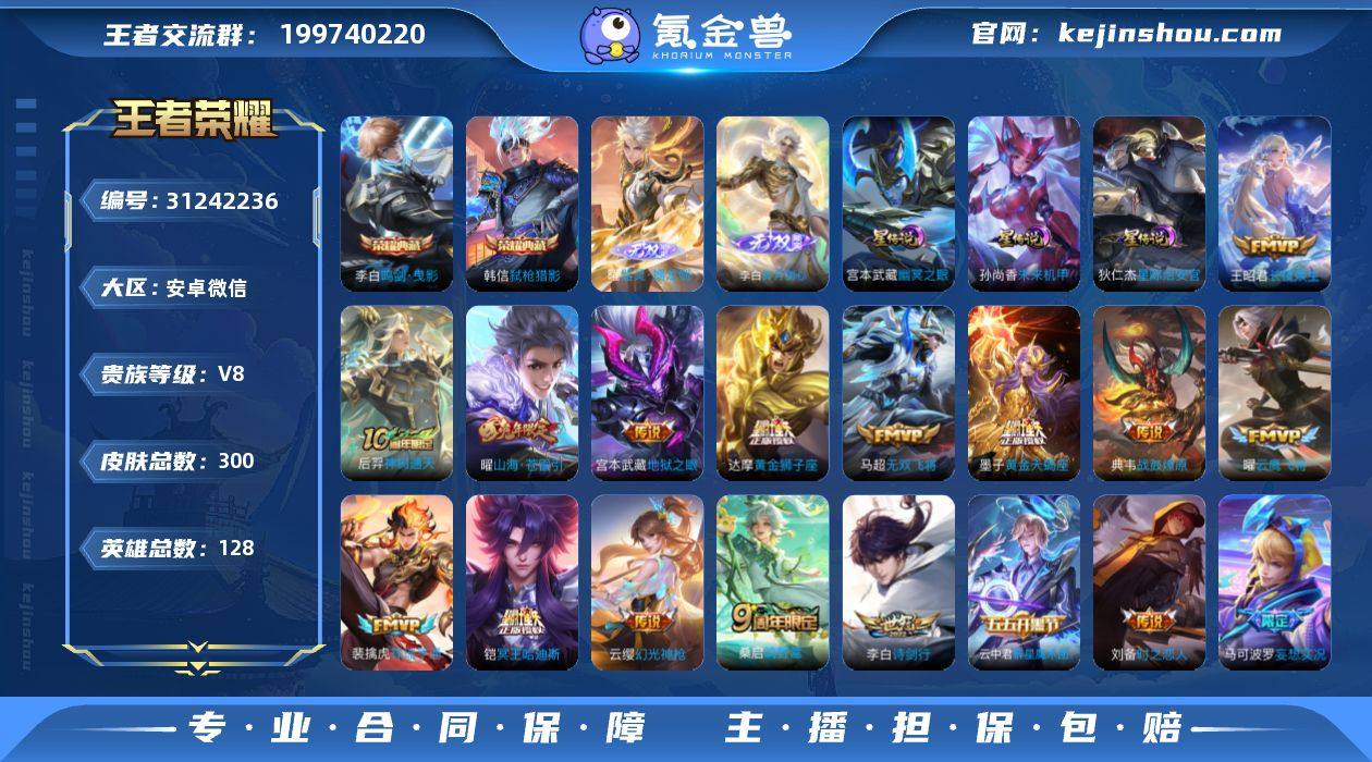 贵族等级:V8 典藏皮肤数:2 珍品无双皮肤数:0 无双皮肤数:2 珍品传说皮肤数:0 传说皮肤数:22 史诗皮肤数:92 皮肤数:300 英雄数:128 段位:星耀 卖家说:看中直接拽走