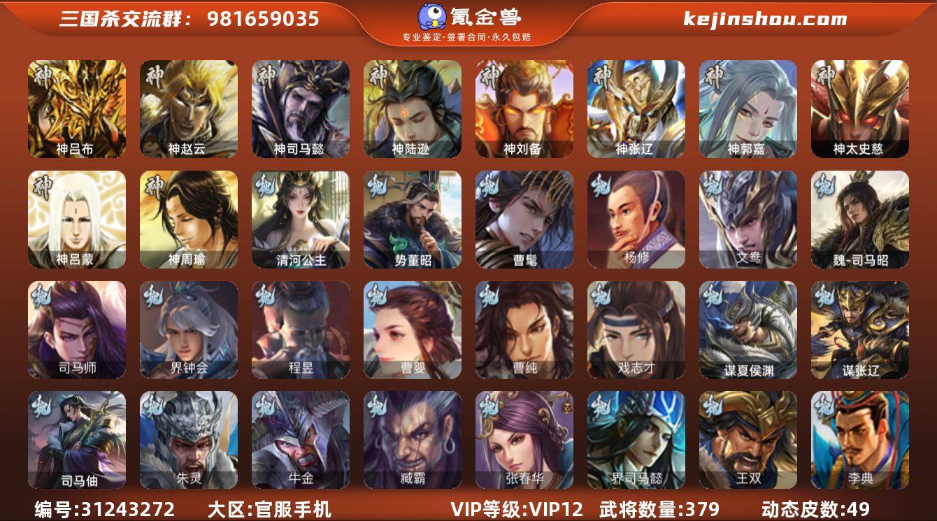 VIP等级: VIP12 官阶: 大将军 武将数量: 379 动态皮肤数量: 49 神将: 神郭嘉,神刘备,神陆逊,神吕布,神司马懿,神太史慈,神张辽,神赵云,神吕蒙,神周瑜 魏国武将: 戏志才,曹纯,曹婴,程昱,界钟会,司马师,魏-司马昭,文鸯,杨修,唐咨-魏,张辽,SP蔡文姬,SP关羽,SP贾诩,SP姜维,卞夫人,蔡贞姬,曹昂,曹操,曹冲,曹洪,曹丕,曹仁,曹叡,曹嵩,王异,张恭,鲁芝,界满宠,曹休,界曹植,满宠,荀攸,王基,钟繇,蒯越蒯良,郭嘉,牵招,荀彧,阮慧,杜畿,界郭嘉,崔琰,界曹丕,界荀彧,朱灵,界甄姬,吕虔,界王异,界许褚,界郭淮,陈群,界邓艾,界曹休,李通,乐进,辛宪英,郭淮,郭皇后,毌丘俭,夏侯惇,曹植,司马朗,界曹操,许褚,界张辽,张郃,钟会,文聘,曹彰,界夏侯惇,诸葛诞,司马懿,甄姬,界徐晃,徐晃,韩浩史涣,胡班,曹真,典韦,夏侯渊,李典,于禁,王双,邓艾,界司马懿,张春华,臧霸,牛金,朱灵(国战),曹髦,清河公主,司马伷,势董昭,谋张辽,谋夏侯渊 蜀国武将: 花鬘,谯周,沙摩柯,王平,张星彩,谋赵云,马云騄,徐庶,吕凯,界关羽,界诸葛亮,邓芝,界伊籍,严颜,界黄月英,界张嶷,赵云,张松,彭羕,李丰,界刘备,界刘禅,谋姜维,刘封,糜竺,谋庞统,黄月英,刘巴,关羽,王甫赵累,吴懿,吴班,祝融,张飞,黄皓,魏延,界周仓,马忠,界法正,糜夫人,界孟获,刘禅,界赵云,界姜维,张翼,关银屏,界祝融,SP孙尚香,SP徐庶,卧龙诸葛,宗预,周仓,简雍,界关兴张苞,诸葛亮,界张飞,法正,界简雍,陈到,界马岱,关平,马岱,界庞统,庞统,诸葛果,马谡,马超,霍峻,廖化,关兴张苞,孟获,夏侯氏,姜维,黄忠,刘备,界马超,李严,马良,傅肜,蒋琬费祎,刘谌,彭羕(国战),甘夫人,蜀-糜芳傅士仁,SP甘夫人,势魏延,势陈到 吴国武将: 界步练师,界徐盛,界朱然,留赞,孙寒华,孙皓,吴景,周处,文鸯,界朱桓,潘濬,张温,周泰,全琮,吕蒙,诸葛恪,界孙尚香,界顾雍,大乔小乔,桥公,谋周瑜,界程普,丁奉,周鲂,界全琮,孙茹,顾雍,孙亮,界朱治,孙休,严畯,界...