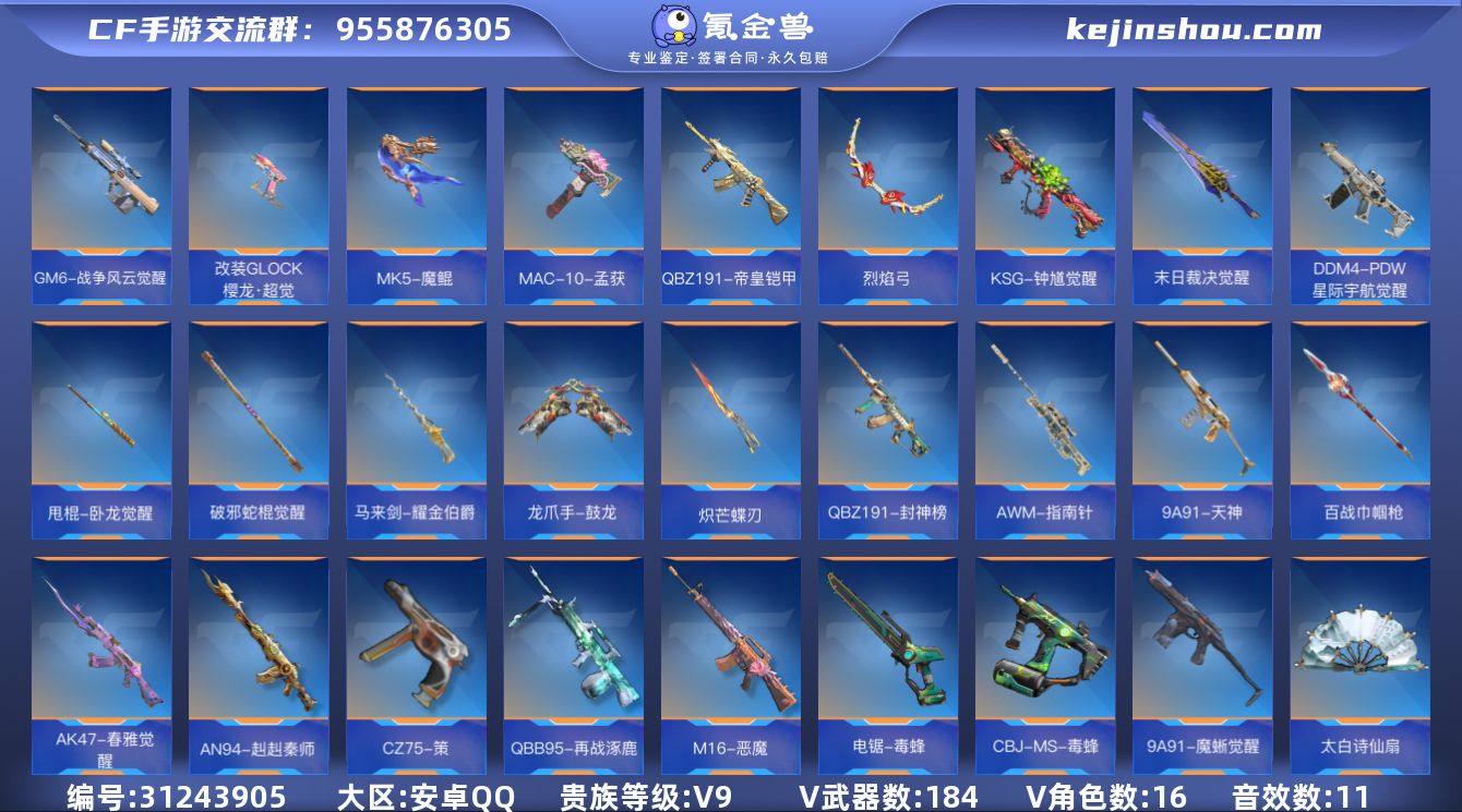 贵族等级:V9 王者武器数:39 v武器数:184 怒至尊,心至尊,幻至尊,魄至尊,狱至尊 卖家说:蝉93片,女团角色下次反场送的就可以再出一个,cf端游也有,连体各种游戏种的游戏,qq会员2028到期,qq超级会员2028到期,黄钻2033年到期员