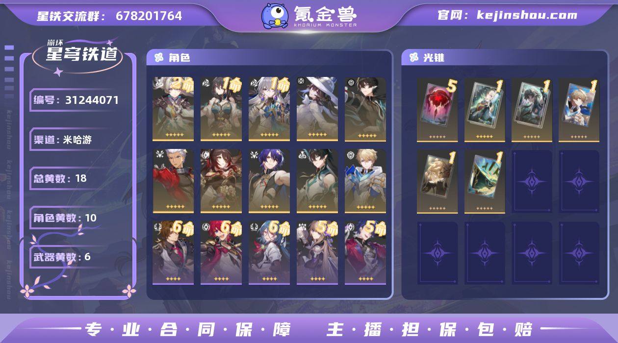 总黄数:18 五星光锥数:6 五星角色数:10 开拓等级:63 开拓者性别:女 星轨专票:1 星琼数量:1447 2命流萤,1命阮·梅,1命布洛妮娅,0命大丽花,0命丹恒·腾荒,0命Archer,0命忘归人,0命真理医生,0命丹恒·饮月,0命杰帕德 5精记一位星神的陨落,1精梦应归于何处,1精比阳光更明亮的,1精制胜的瞬间,1精如泥酣眠,1精星海巡航 换绑材料:可提供换绑材料 邮箱状态:送网易邮箱 psn绑定情况:否 taptap绑定情况:否 邮箱实名情况:邮箱已实名