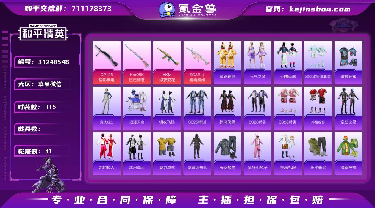 AL670772 【小身法素材 浪漫天命 鲨鱼裤 狂沙舞者 4个特效枪 粉熊背包】 热力值9049 枪皮数量41 套装数量24 时装数115 战备数22 其他武器皮肤37 头盔7 战备9 伙伴1 其他武器皮肤:M16A4-幻世战舞者,M16A4-冰河战士,蜜罐-精灵梦叶罗丽,M416-红色方程式,M416-糯团青竹,AKM-龙的传人,M762-天降萌叽,AUG-耀粉歌者,SCAR-L-夜灯,M200-惊鸿侠骨,AMR-乌木金纹,Kar98K-彩虹符号,M417-惊鸿侠骨,SKS-炫彩节奏,VSS-彩虹符号,UZI-天降萌叽,UMP45-诡娃娃,P90-乌木金纹,P90-倾城蜜语,MP5K-乌木金纹,汤姆逊-天降萌叽,AKS-74U-乌木金纹,SPAS-12-乌木金纹,S686-彩虹符号,S12K-破晓战魂,DBS-乌木金纹,DP-28-彩虹符号,M249-破晓战魂,M249-彩虹符号,MG3-惊鸿侠骨,MG3-幻世战舞者,TMP-9-未来歌姬,平底锅-空岛之星,平底锅-惊鸿侠骨,破片手榴弹-拽到爆炸,破片手榴弹-呆爆全场,爆炸猎弓-惊鸿侠骨; 头盔:冰河战士头盔(3级),龙的传人头盔(3级),2B战斗服款头盔(3级),炫光之旅头盔(3级),龙的传人头盔(2级),薄荷星砂头盔(1级),龙的传人头盔(1级); 战备:鼓掌,不行,俄舞,爱心发射,肯定,你好,走,主题场景-冒险世界,主题场景-勇攀高峰; 伙伴:伙伴-盔仔;