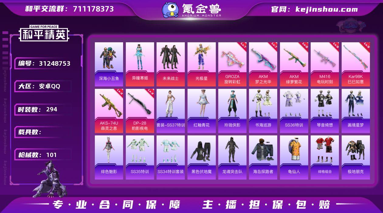 热力值:31975 时装数:294 枪械数:101 战备数:72 游戏等级:55 卓越印记:2 传奇印记:1 绝世印记:0 异瞳寒姬,光极星,未来战士 七级AKM-梦之光华,七级GROZA-旋转彩虹,五级AKM-绿萝繁花,五级Kar98K-巳巳如意,五级M416-电玩时刻,三级AKS-74U-森灵之息,三级DP-28-豹影疾电 炫彩糖果降落伞,炫彩糖果飞行器,闲梦青缨降落伞,旋转彩虹降落伞 红釉青花,SS37特训,玲珑侠影,画境星梦,琴音绮想,书海巡游,SS36特训,炫彩糖果,绯色魅影,SS35特训,SS34特训套装,冰川格斗者,冰冻风暴,缤纷果语,长空猛禽,东方飞龙,绯格组合,风华少年志,疯狂小兔子,福星高照,飞行日记,龟仙人,海岛探路者,黑色伏地魔,幻世战舞者,极地朋克,惊鸿侠骨,娇憨猪猪,竞技名士,吉莉礼服,锦衣飞扬,空岛之星,蓝彩潮人,龙的传人,龙魂突击队,冷酷挑战者,六六大吉,蓝色运动,恋语绒绒,漫步者,梦幻奶油,魅力单车,萌趣咩咩,霓虹街区,怒火燎原,破蛋小黄鸡,轻风白浪,青涩时光,青玉碎影,日照花林,深海小丑鱼,深蓝色名流,森林游猎者,SS17特训,SS21特训,SS22特训,SS25特训,SS26特训,SS27特训,SS28特训,SS29特训,SS31特训套装,SS32特训套装,SS33特训套装,酸甜橘柚,田园牧歌,无烬之地,王牌教练,旭日情侣,摇滚战魂,耀眼新星 AA12-G-雨过天青,AMR-雨过天青,M16A4-雨过天青,PKM-雨过天青,沙漠之鹰-雨过天青,M249-拉面少女,燃烧瓶-福马献瑞,PKM-啾咪啾咪,AA12-G-画境星梦,ACE32-画境星梦,M1加兰德-画境星梦,MK12-乌木金纹,MP5K-画境星梦,平底锅-画境星梦,UMP45-极意拳锋,铝热弹-炫彩糖果,UZI-炫彩糖果,燃点复合弓-罪夜之冕,AUG-紫晶流影,P90-玩趣呆呆,AC-VAL-天降萌叽,AKM-百万伏特,AKM-龙的传人,爆炸猎弓-惊鸿侠骨,DP-28-旋转彩虹,GROZA-海盐豹豹,GROZA-田园牧歌,GROZA-影袭,Kar98K-彩虹符号,M16A4-冰河战士,M16A4-幻世战舞者,M200-惊鸿侠骨,M200-乌木金纹,M249-百万伏特,M249-彩虹符号,M249-莲影清波,M249-糯团青竹,M416-糯团青竹,M417-惊鸿侠骨,M762-天降萌叽,MG3-幻世战舞者,MG3-惊鸿侠骨,蜜獾-天降萌叽,蜜獾-娇憨猪猪,Mini14-炫彩节奏,Mini14-旋转彩虹,MK20-H-樱桃泡泡,Mk47-百万伏特,平底锅-惊鸿侠骨,平底锅-娇憨猪猪,平底锅-田园牧歌,S12K-娇憨猪猪,S12K-玩趣呆呆,S1897-百万伏特,SCAR-L-黄金龙骨,SCAR-L-夜灯,SCAR-L-玉兔迎春,SKS-金玉无双,SKS-糯团青竹,SKS-炫彩节奏,SLR-娇憨猪猪,沙漠之鹰-旋转彩虹,SPAS-12-田园牧歌,汤姆逊-天降萌叽,汤姆逊-炫彩节奏,UZI-冰河战士,UZI-娇憨猪猪,UZI-啾咪啾咪,UZI-金玉无双,UZI-天降萌叽,UZI-炫彩节奏,UZI-影袭,Vector-生命誓言,Vector-田园牧歌,VSS-田园牧歌 雨过天青降落伞,马上有福飞行器,画境星梦降落伞,SS36王牌降落伞,空岛之星尾迹,登顶巅峰飞行器,SS35王牌降落伞,惊鸿侠骨降落伞,娇憨猪猪降落伞,田园牧歌降落伞 实名:可二次实名