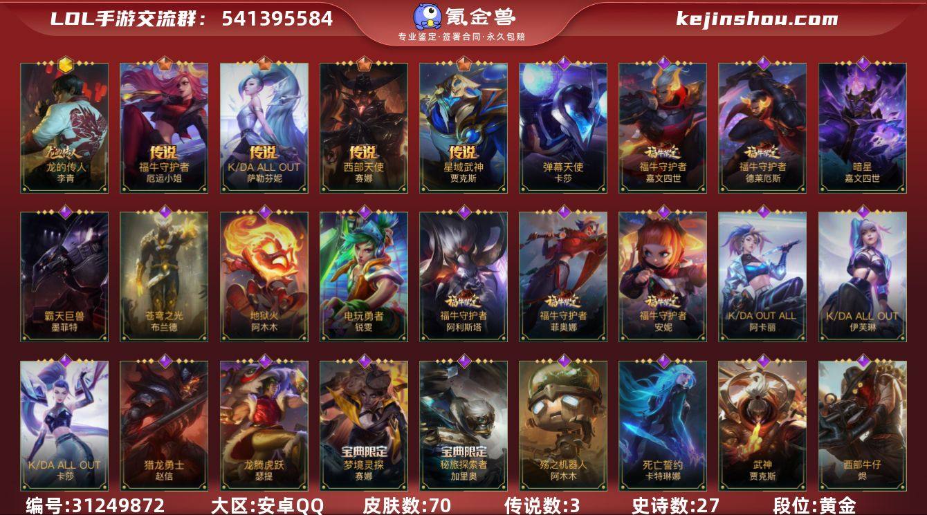 英雄82 皮肤70 1神话/3传说/27史诗/ 荣耀黄金Ⅳ 【有无防沉迷】无防沉迷 【游戏等级】46 【游戏区服】安卓QQ 【英雄数量】82 【皮肤数量】70 【游戏段位】荣耀黄金Ⅳ 【终极皮肤】0 【典藏皮肤】0 【神话皮肤】1 龙的传人李青 【传说皮肤】3 福牛守护者厄运小姐 KDAALLOUT萨勒芬妮 西部天使赛娜 【稀有回城特效】 【史诗皮肤】27 暗星嘉文四世 霸天巨兽墨菲特 苍穹之光布兰德 弹幕天使卡莎 地狱火阿木木 电玩勇者锐雯 福牛守护者菲奥娜 福牛守护者德莱厄斯 福牛守护者安妮 福牛守护者嘉文四世 福牛守护者阿利斯塔 KDAALLOUT卡莎 KDAALLOUT伊芙琳 KDAALLOUT阿卡丽 猎龙勇士赵信 龙腾虎跃瑟提 梦境灵探赛娜 秘旅探索者加里奥 殇之机器人阿木木 死亡誓约卡特琳娜 武神贾克斯 小恶魔崔丝塔娜 腥红之月崔斯特 泳池派对奥莉安娜 泳池派对李青 泳池派对蕾欧娜 真实伤害赛娜 【其他皮肤】39 冰川勇者伊泽瑞尔 冰霜亚龙希瓦娜 苍穹之光韦鲁斯 苍穹之光薇恩 冲击之刃劫 创世魔神内瑟斯 单身贵族内瑟斯 德莱德莱德莱文 鳄霸雷克顿 绯金鲛灵娜美 绯金魅影伊芙琳 风执事加里奥 哥特女仆奥莉安娜 光明骑士贾克斯 光耀之灵璐璐 光耀之刃泰达米尔 光耀之心奥莉安娜 河水之灵娜美 黑暗骑士奥拉夫 黑暗骑士艾希 极地女神艾希 鲛妮座人娜美 科学狂人吉格斯 末路教父格雷福斯 女帝厄运小姐 烧烤女神蕾欧娜 狮心布隆 时之砂艾克 双城之战蔚 双城之战金克丝 探戈灵魂崔斯特 兔宝宝吉格斯 五连摇滚键盘手娑娜 无情重炮格雷福斯 西部牛仔亚索 西部牛仔厄运小姐 熊猫提莫 银色之牙阿卡丽 脏兮兮努努和威朗普