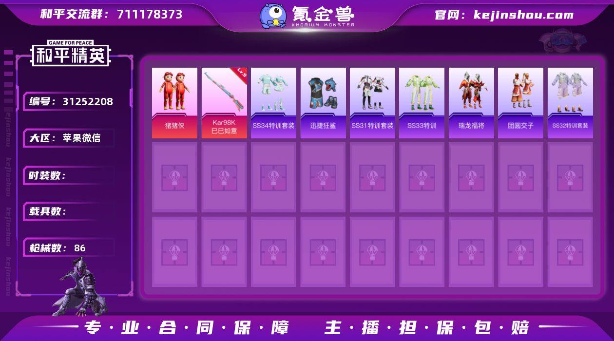 苹果微信 可二次 1粉装1特效枪 5热门70套装86枪皮 25931热力值 11印记 历史超级王牌11星 猪猪侠 Kar98K-巳巳如意 (5级) 迅捷狂鲨 团圆交子 瑞龙福将 M762-奇异狩猎者 M762-瑞龙福将 神秘黑猫背包 古堡领主背包 和平精英账号