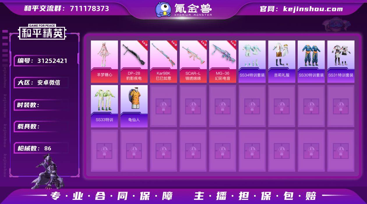 安卓微信 可二次 1粉装4特效枪1飞行器54套装86枪皮 AKM-缤纷海域 羊梦糖心 SCAR-L-锦绣绵绵(5级) Kar98K-巳巳如意(5级) MG-36-幻彩电音(4级) DP-28-豹影疾电(5级) 星之彼岸飞行器 龟仙人 和平精英账号