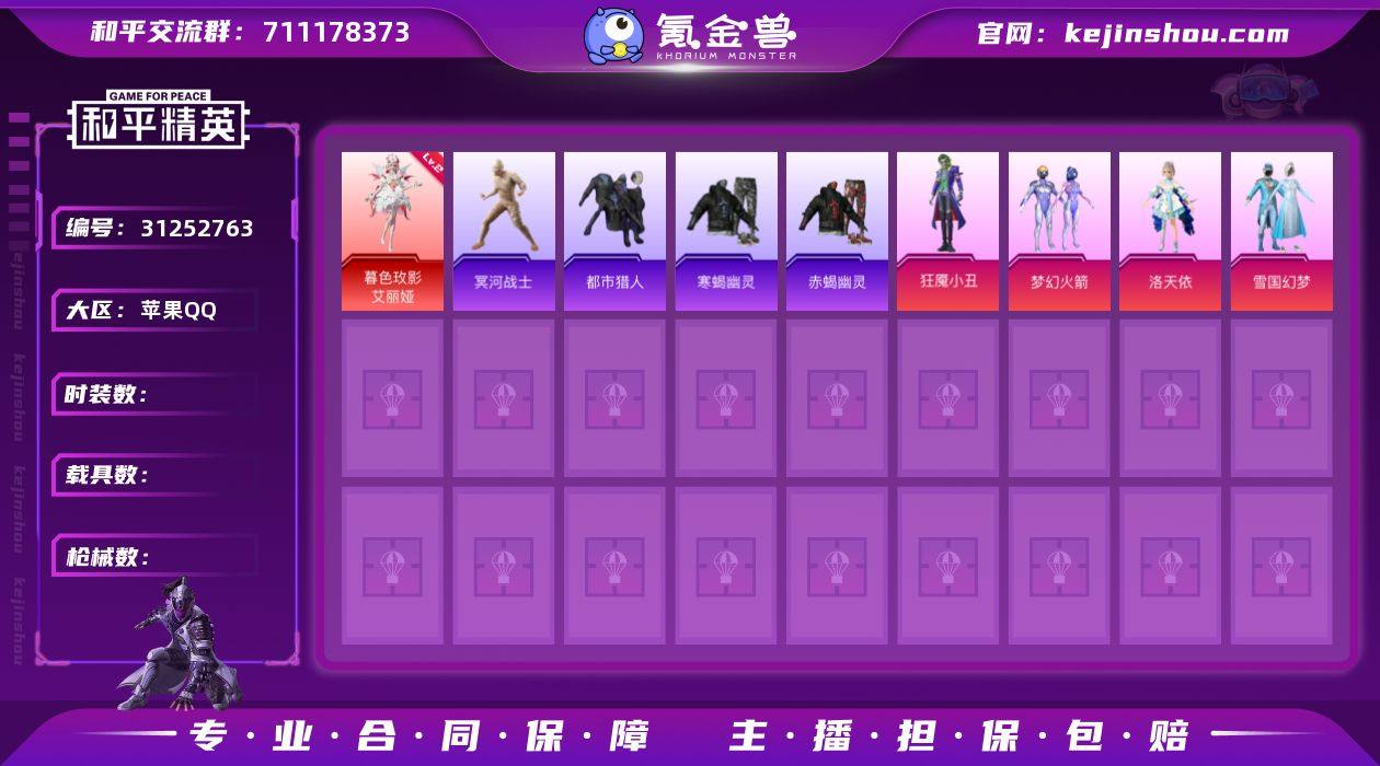 【主播推荐】实名: 不可修改 时装数: 1130 载具数: 8 枪械数: 461 战备数: 309 神级装扮: 精灵之光-露米娜,幽焰骑士-维塔 ,魔童闹海-哪吒 热门装扮: 奇异狩猎者,梦幻火箭(新101),幻影战神,甜心巧克力,深渊皇后,宝贝奶油派,浪漫波比,天使彩虹糖,梦魇先生,放客神游,暗夜武装,万圣娃娃,金曜白虎,极致幻想,新星烈龙,银刃赛罗,扶摇飞仙,精灵迷巫,心之恋语,山涧鹿灵,相思残雪,巡查员衣服,冥河战士,蓝莓炮弹,傲雪凌霜,冰川红玫,冰川幽秘,大橘为重,奇迹天团,软萌银虎,神秘黑猫,派对舞王,炫光之旅,闲梦青缨,甜心首席,蜜语绒猫,美雪,脉冲星,守护天翼,星穹咏叹调,异瞳寒姬 载具: 双人摩托-梦幻火箭,合金龙骨(红),空客H135-恋语之翼,路特斯EVIJA(电光紫),宾利欧陆GT敞篷(深空蓝),照夜玉狮子,仰望U8(雷霆紫),宝马M4(灿阳金),晶梦灵驹 稀有枪皮: UMP45雪国精灵,M762甜蜜誓约,M24星之信仰,AKM炫紫旋律,Kar98K伏魔团,M416五爪金龙,SCAR-L梦幻火箭,DP-28扶摇飞仙,M416心之恋语,UZI绮梦青鸾,AKM梦之光华,SCAR-L机甲封神,M416风花雪月,M416暖熊萌萌,Vector环太平洋,M249绒雪飘舞,M416至情至圣,汤姆逊冰川粉黛,M417第五大道,P90能量风暴,AMR炫光之旅,平底锅林间仙鹿,MG3酷泡奶龙,PKM江南烟雨,Mk14精灵梦叶罗丽,破片手榴弹粉粉猫爪,烟雾弹猫咪绅士,UMP45-宇宙意志,GROZA-精灵之光,AKM-幽焰骑士,Kar98K-巳巳如意,M416-女娲灵识,MG-36-幻梦之森,M16A4-晶梦幻蝶,AUG-暖羊咩咩,AUG-圣斗士星矢,破片手榴弹-瓶中星球,AKS-74U-星穹咏叹调,DP-28-豹影疾电,SCAR-L-魔童闹海 哪吒