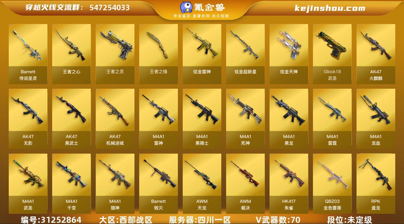 四川一区-78V-6王者武器数-4炫金武器数 【传说武器】:传说圣灵 【热门武器】:传说圣灵,QBZ03-金色蔷薇,HK417-朱雀,M4A1-青龙,死亡之眼*2,M4A1-黑骑士,汤姆逊-烈龙*6,RPK-盘龙,斯泰尔-蝴蝶,沙鹰-修罗*2 【王者炫金武器】:王者之心,王者之灵,王者之锋,炫金雷神,炫金超新星,炫金天神*2 【音效卡】:AK47-火麒麟音效卡,Barrett-毁灭音效卡 【皮肤】:雷神-荣耀之魄,火麒麟-雷神,火麒麟-平天大圣,毁灭耀金皮肤,毁灭-巅峰荣耀 皮肤,黑骑士-AG-S4冠军典藏,天龙-能量核心,修罗-能量核心 【角色】:瞳,炫,审判者,乔伊教练,修道士,云海玲珑,初恋灵狐,风暴女,虎妞,嘉年华灵狐,娟娟,零-水下丽影,麻雀,萌儿,潘多拉-甜心教官,斯沃特-X,影武者-X 【人偶武器】:天龙-曼陀罗,斯泰尔-蝴蝶,AWM-灵狐-15周年嘉年华,夺魂,迷你生化手雷*2 【暴走生化】:死亡之眼*2,超级对讲机 【挑战大师】:冰龙粉碎者-白马银枪,激光毁灭者III-白马银枪 【英雄级武器】:M4A1-千变,AK47-火麒麟,M4A1-黑龙,M4A1-雷神,M4A1-黑骑士,AK47-无影,M4A1-死神,AK47-黑武士,M4A1-武圣,AK47-机械迷城,M4A1-龙血,M4A1-雷霆,M4A1-青龙,HK417-朱雀,QBZ03-金色蔷薇,M4A1-猎神,王者之势-觉醒版,AWM-天龙,Barrett-毁灭*2,AWM-裁决,王者风神-觉醒版,RPK-盘龙,炼狱-悦蓝-觉醒版,汤姆逊-烈龙*6,沙鹰-修罗*2,COP-雷霆*2,Glock18-武圣,屠龙*4,龙啸*2,擎天,麒麟刺,擎天-竞技荣光,高爆手雷-雷霆*7,高爆手雷-竞技荣光,闪光弹-雷霆*7,闪光弹-竞技荣光,烟雾弹-雷霆*7,烟雾弹-竞技荣光 【道具】:CFS限定背包,炫彩背包,绿色巨人,灵魂忍者,变异宝贝,迷雾幽灵,生化弹匣,夺命之镰,防化服*2,金色流光-枪王排位*2,星辰流光-枪王排位,枪王排位28赛季金色流光,枪王排位29赛季金色流光,...